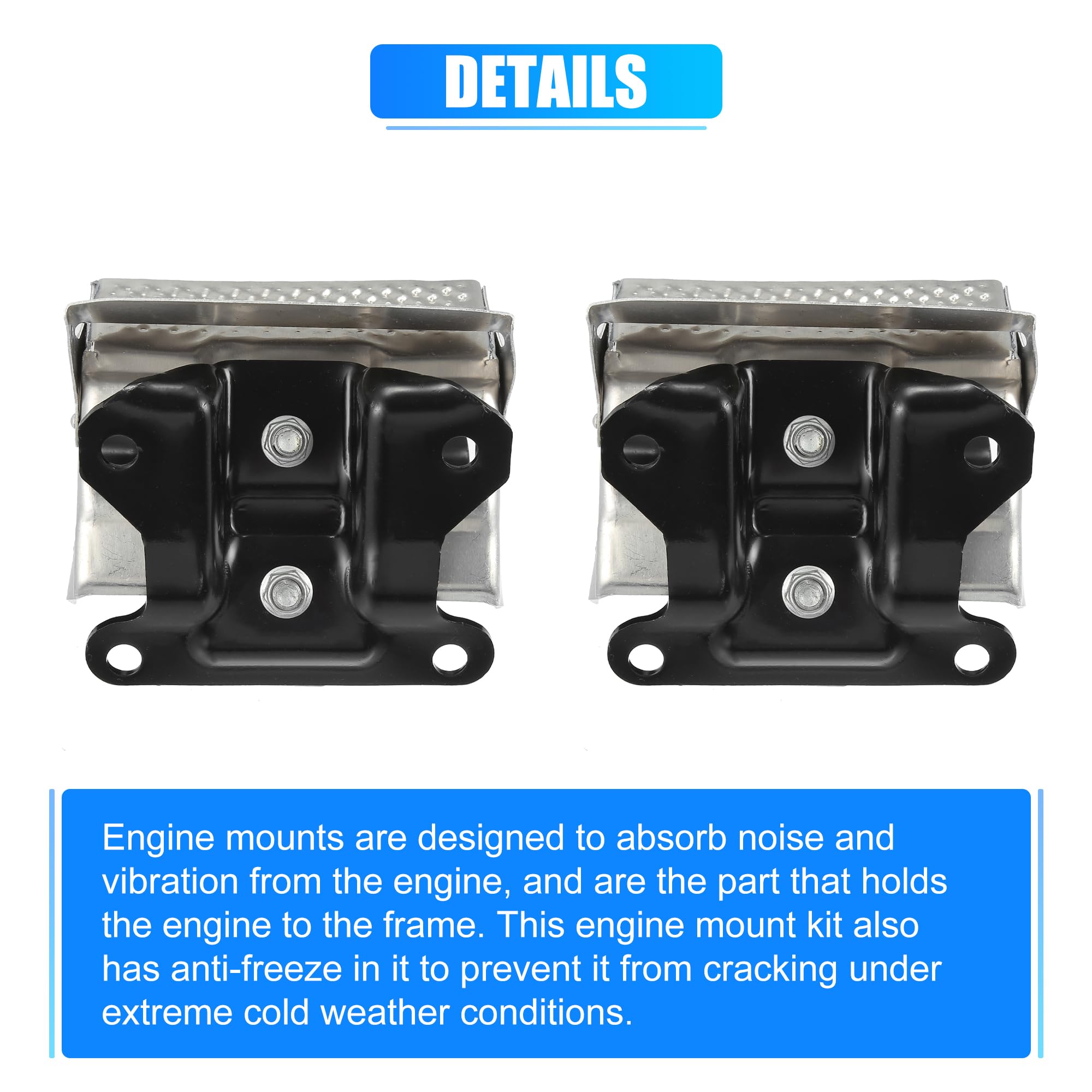 エンジンマウントは、エンジンからの騒音や振動を吸収するように設計されており、エンジンをフレームに固定する部品です。 このエンジン マウント キットには、極寒の気象条件下での亀裂を防ぐために不凍液も含まれています。