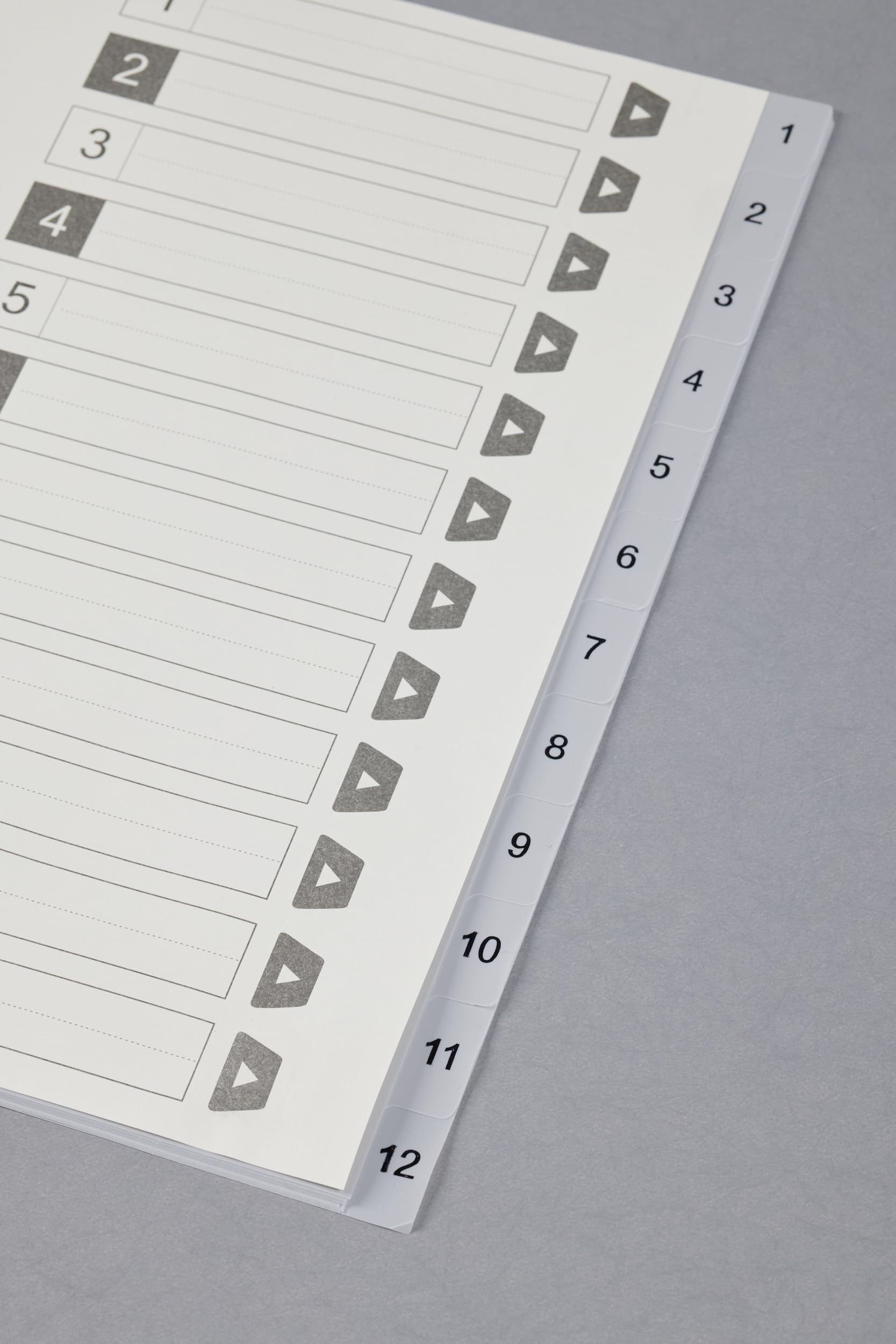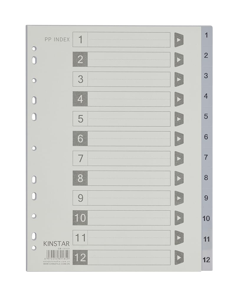 20件のセット商品で、あらかじめ順番に配置されているため、届いた後すぐに使用でき、とても便利です。書類整理に非常に役立ちます。インデックスは12箇所に配置されており、目的のページを素早く見つけることができます。最初のインデックスラベルは紙製で、残りの部分はPP素材です。