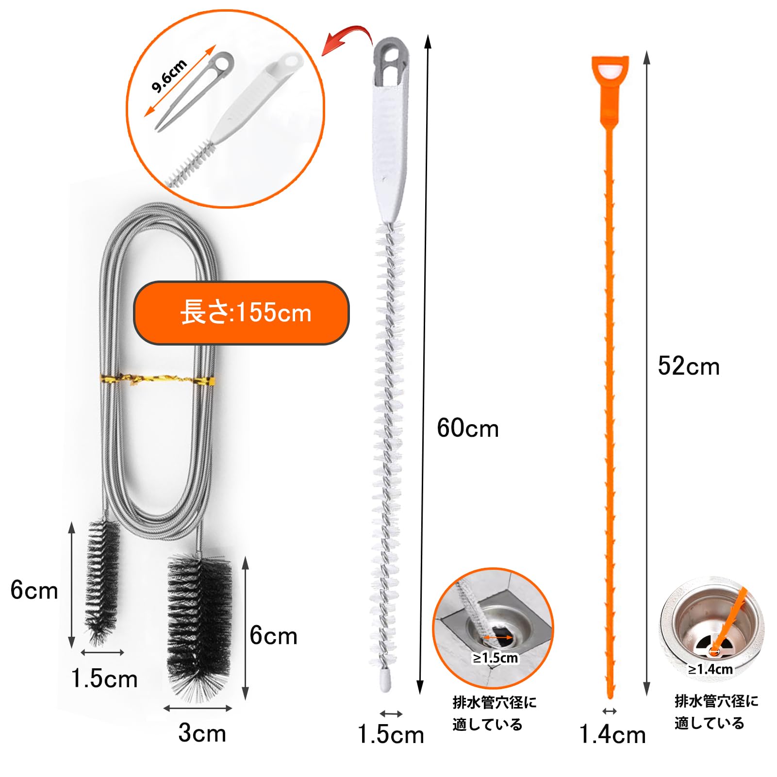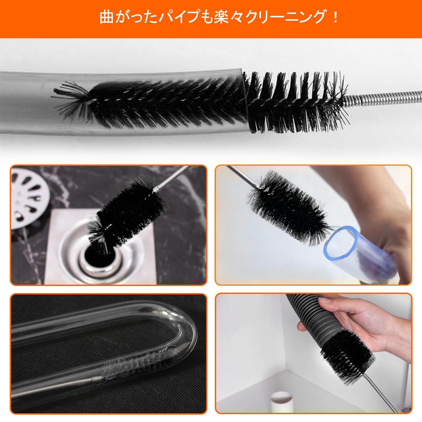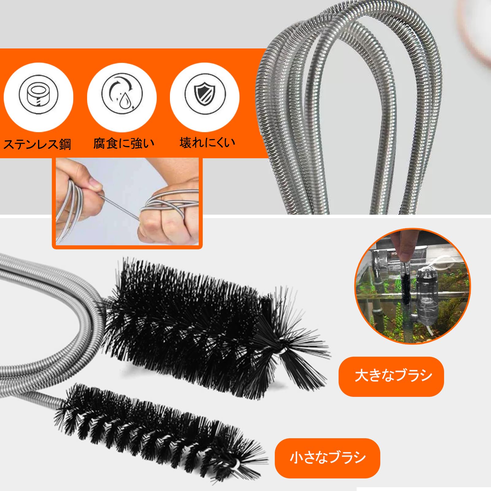 【パッケージ内容】 61インチの両頭排水クリーナーブラシ(1個) 20インチの排水口スネークヘアリムーバー(1個) 23.6インチ アップグレード版クリーニングブラシ クリーニング鉗子付き (1個) 下水道のシンクを掃除したり、細いパイプを掃除したり、手の届きにくい場所をこすり落とす必要がある場合でも、このセットは完璧なツールを提供します 【しなやかで曲げやすい】 両頭排水口クリーナーブラシと排水管オーバーフローブラシは、パイプに合わせて任意の形状に曲げることができます排水スネークはPP素材でできており、柔軟性が高く、パイプを傷つけることなく、たまった髪の毛、食べ物、ゴミ、その他の障害物/ゴミを簡単につかんで取り除くことができます 【実用的な両頭パイプクリーニングブラシ】 このクリーニングブラシのシャフトは高品質のステンレススチール製で、耐久性があります パイプ内の頑固な残留物や藻類を簡単にきれいにできます 水槽、水槽、ウォーターポンプ、フィルター、コネクター、パイプ、シャワー排水管、その他のパイプの洗浄に高性能 【考え抜かれたデザイン】 アップグレードされたクリーニングブラシにはクリーニングトングが付属し、手を汚さずにツールを再利用できます 【幅広い用途】 当社の実用的なセットは、髪をきれいにし、パイプを毎日掃除する機能をカバーしています バスルーム、トイレ、キッチンのシンク、洗面台、水槽、水槽、ウォーターポンプ、バスタブ、シャワー排水管の掃除、その他のチューブで広く使用されています