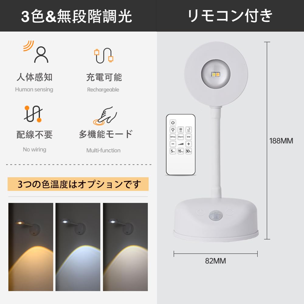 9色RGB USB-C充電式 壁掛けライト ウォールランプ ベッドライト 壁ランプ、間接照明 ウォールライト リモコンとタッチ付き寝室壁掛けライト、タイマー機能、360°回転ヘッドランプに適用
