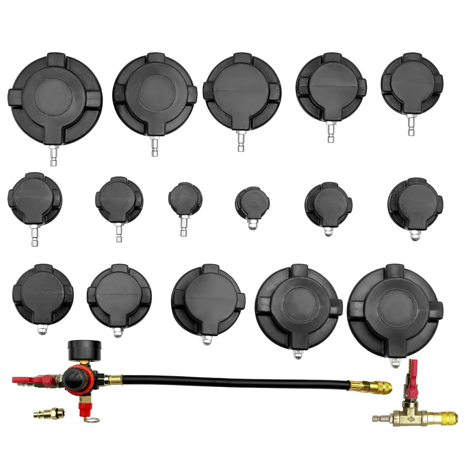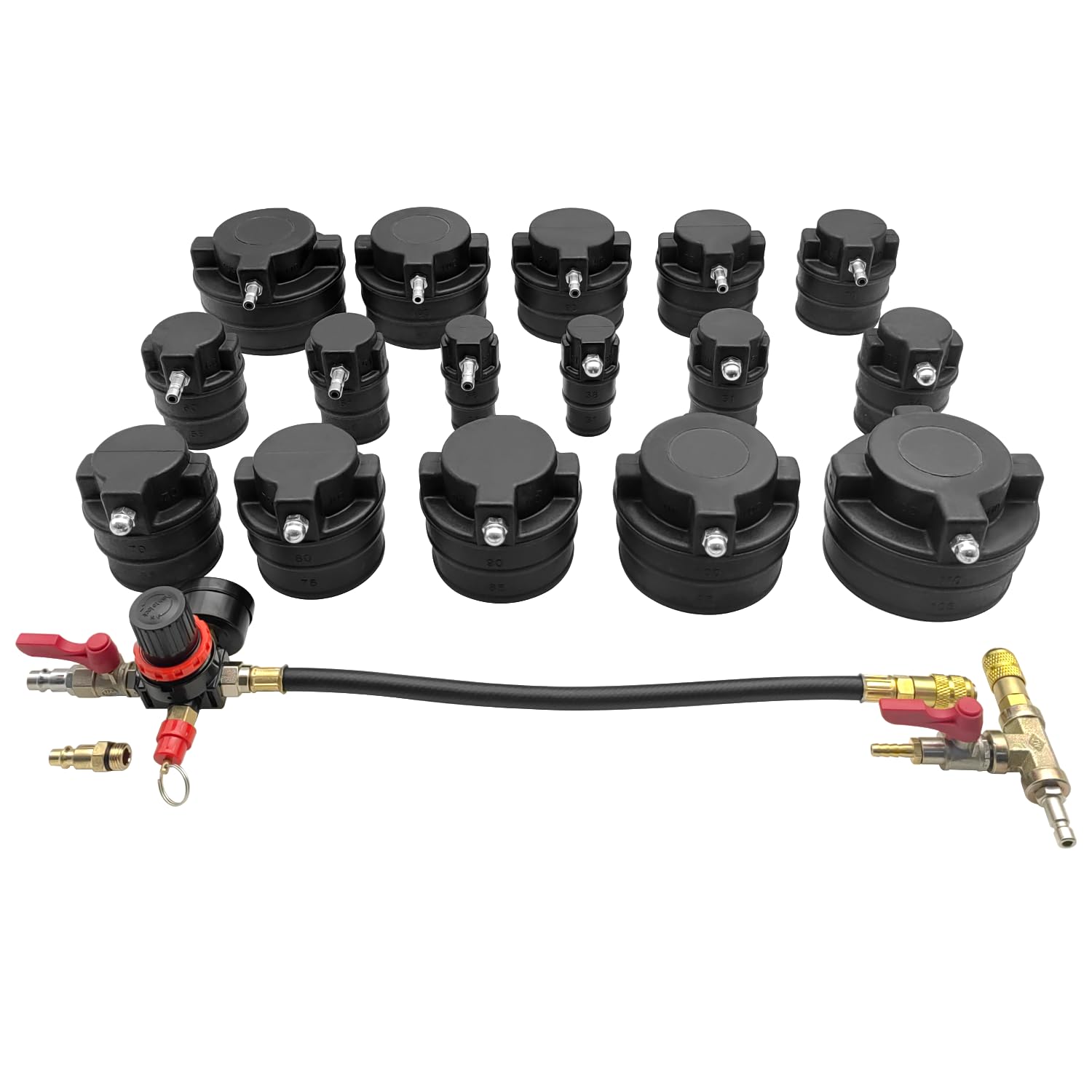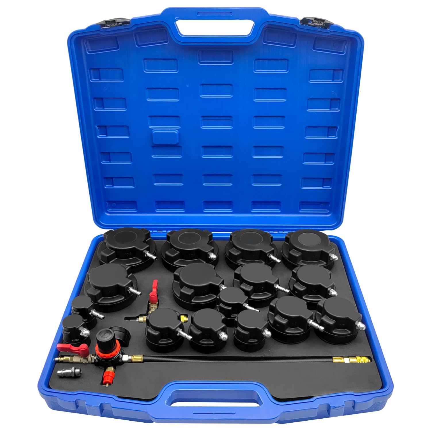 多機能な漏れ検出ツールセット 19PCターボシステムリークテスターキットは、ターボ、冷却、排気システムの漏れ検出に必要なすべてのツールが揃っています。1-1/4インチから4-3/8インチまでの7組の段階アダプター、ブランクアダプター、圧力計が含まれており、システムを徹底的にテストできます。この漏れ検出キットは、様々なターボチャージャー、冷却システム、排気パイプを搭載した車両やライトトラックを含む広範な車種に適しています。