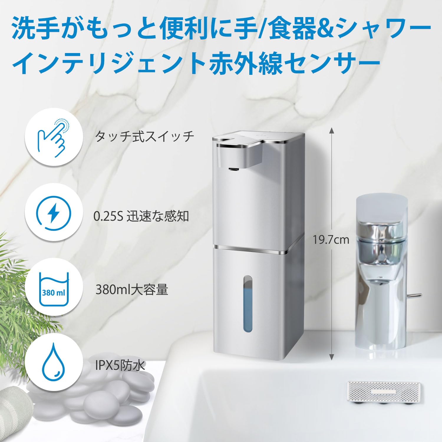 "自动皂液器"采用高灵敏度红外线传感器技术,仅需0.25s内自动产生泡沫。 不需要用手直接触碰泵,卫生,周围不易弄脏。 与手按压泵相比,自动皂液器无需触摸即可将洗手液拿起,卫生放心。