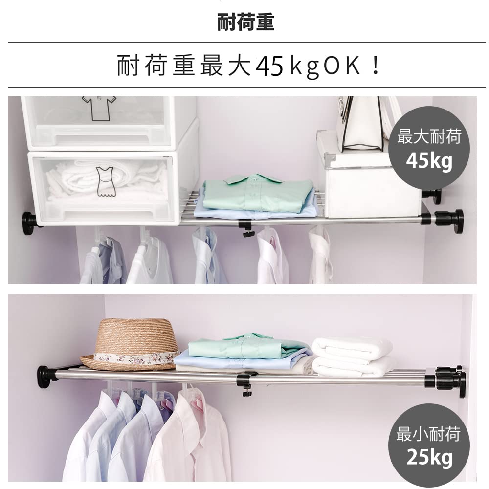 【使用上の注意事項】 ●直射日光の当たる所、高温となる所、また浴室のような湿度の高い所では使用しないでください。(劣化やサビの原因になります。) ●必ず表示耐荷重の範囲内で使用してください。 ●荷重が1か所に集中しないように分散して物を載せてください。 ●急激に荷重を掛けたり強く引っ張る、揺する、ぶら下がるなどの行為は落下やケガの原因になります。 ●万一に備え、危険物、貴重品、破損の恐れのあるものなどは載せたり、掛けたり、周囲に置いたりしないでください。 ●消臭剤、芳香剤、化粧品、整髪料、酸性洗剤、アルカリ性洗剤、油脂、有機溶剤(ベンジン、シンナーなど)の付着は変質劣化の原因になります。万一付着した場合は直ちに取り除いてください。 ●汚れは水で薄めた中性洗剤で拭き取り、洗剤分が残らないよう拭き取った後、乾いた布で拭き取ってください。たわし、磨き粉で磨くと製品に傷がつきます。 ●樹脂部品は特性上、油の付着や紫外線により劣化が生じます。 ●商品に破損や変形等が生じましたら、危険ですので直ちに使用を中止してください。 ●パイプに防錆油が付着していることがあります。使用には問題ありませんが衣服等に付く恐れがありますので拭き取ってから使用してください。 ●取り付け2~3日後、また週に1回程度定期的に取り付け状態を確認してください。 【取付上の注意事項】 ●この製品は屋内用です。 ●取付面を強力につっぱって取り付けますので、取り付け跡が残る場合があります。支障の無い所で使用してください。 ●コンクリート壁や柱、壁材と下地に十分な強度がある所に取り付けてください。ボードやベニヤなどの弱い壁に取り付ける場合は、下地に桟のある場所や壁面を市販の木板などで補強してください。 ●斜面や湾曲面、凸凹のある壁面には設置できません。 ●高温となる所、屋外や直射日光の当たる所、浴室や湿度の高い所、水が掛かる所には使用しないでください。 ●万一に備え、貴重品、危険物、破損の恐れがある物の周囲、燃焼器具、発熱器具、水道の蛇口の上や常時人がいる上には取り付けないでください。 ●分解や改造はしないでください。 ●水平(壁面に垂直)に取り付けてください。 ●表示の取り付け範囲内で取り付けてください。 ●長さ固定ねじは根元までしっかり締めてください。不十分な場合棚が落下する原因になります。 ●取り付け後、状態の確認をしてください
