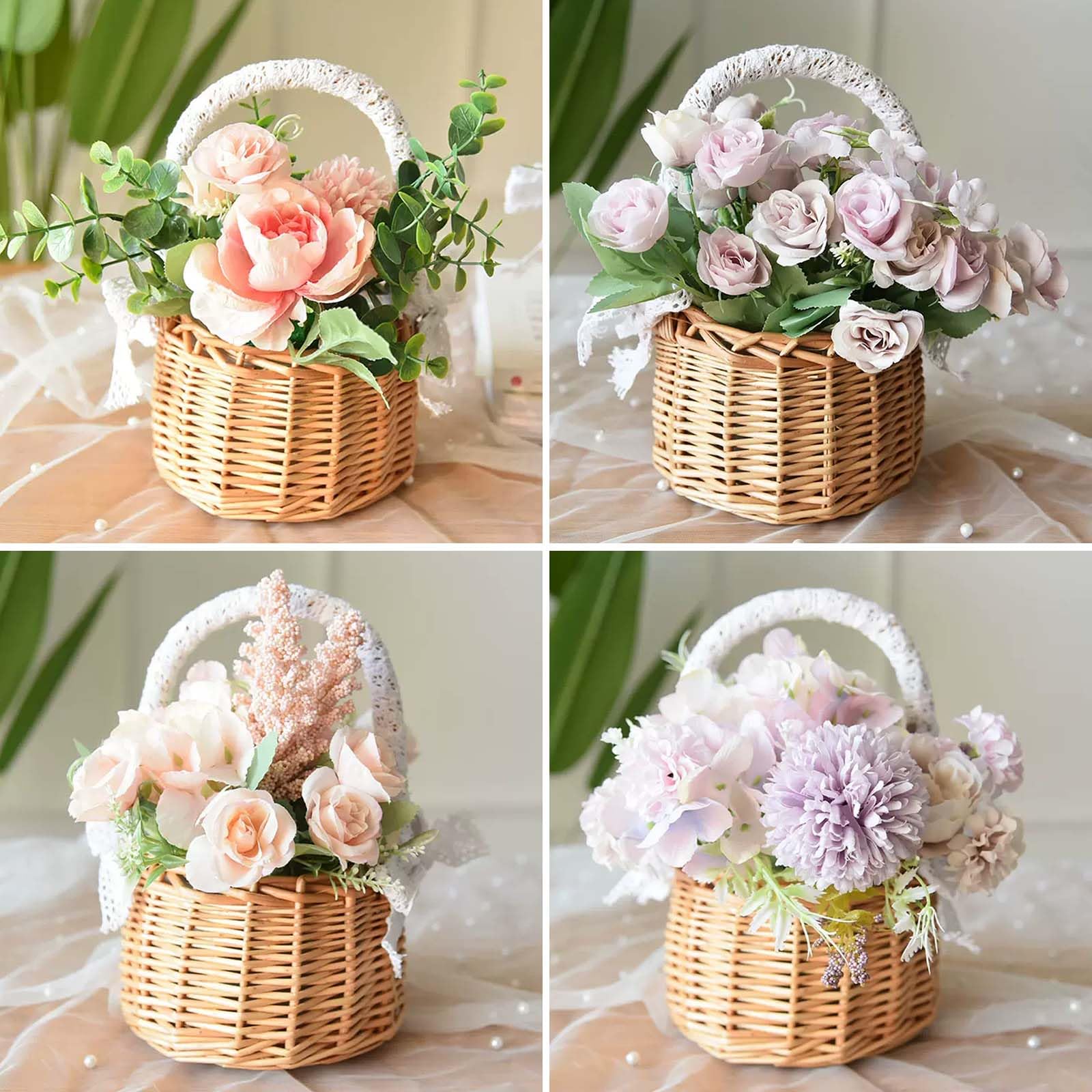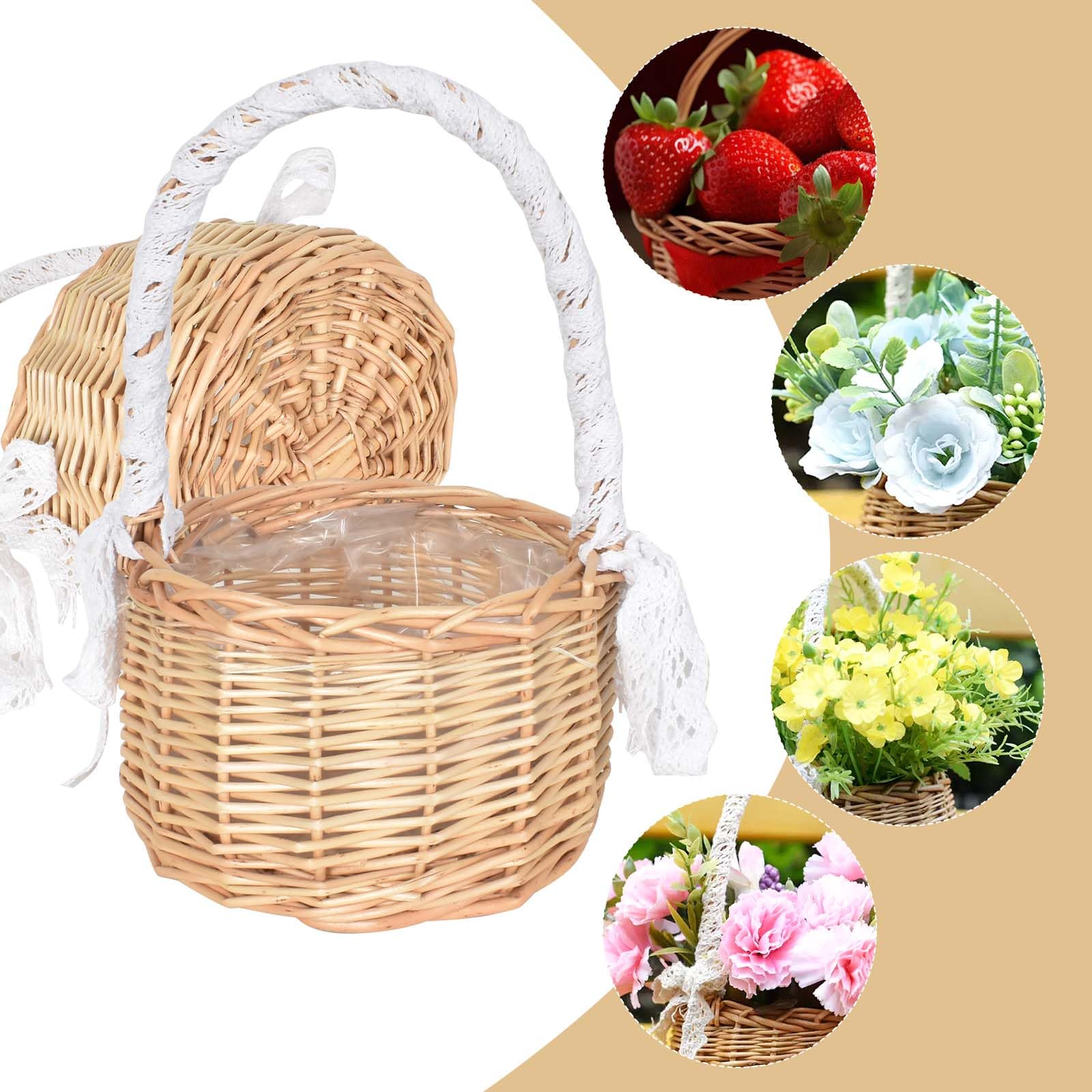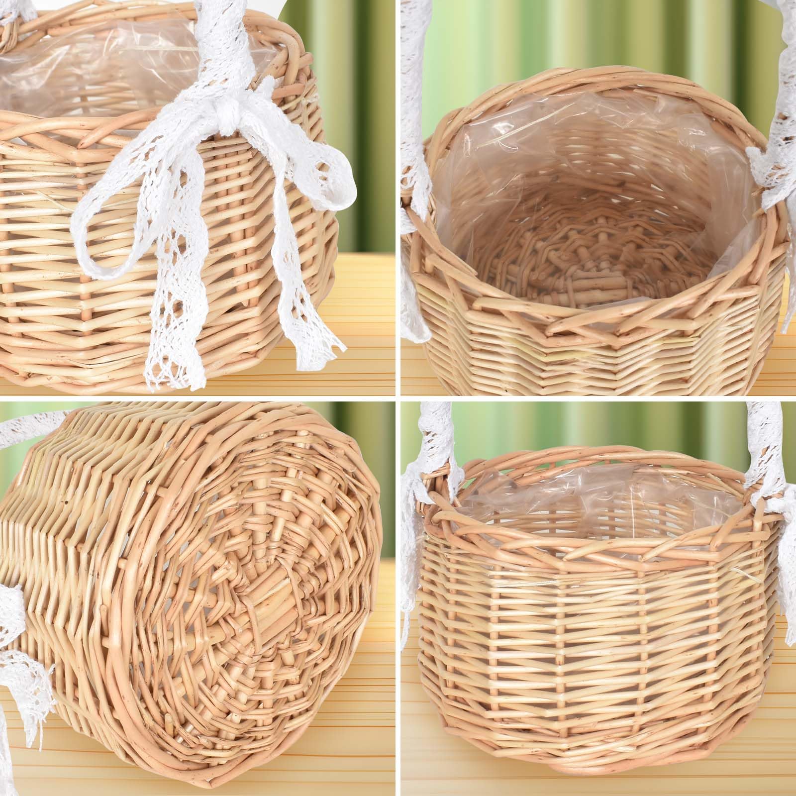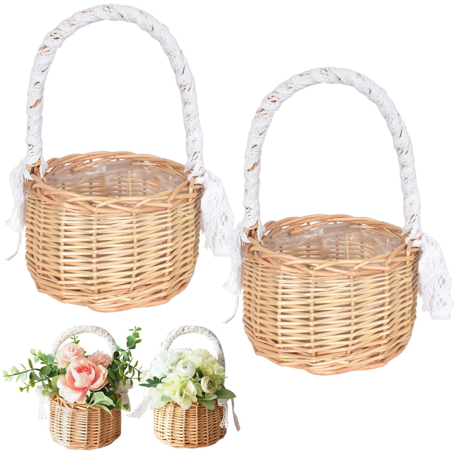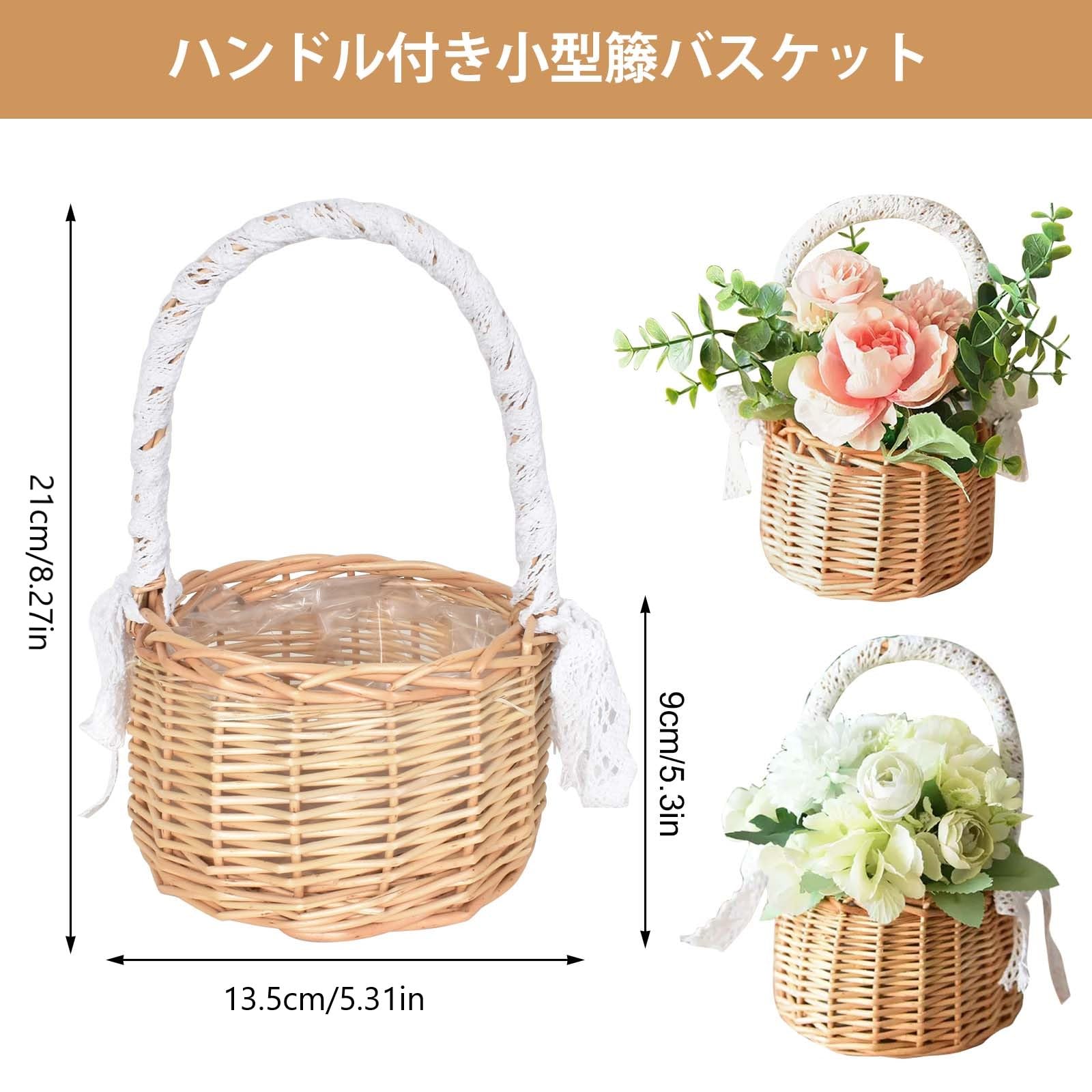 フラワーガール バスケット 編み込み バスケット 取っ手付き籐 ウェディング バスケット 花かご 小さい 2個セット 柳 バスケット ハンドルとホワイトリボン付き 軽量 小物入れ 結婚式 披露宴 花嫁 パーティー アクセサリー イースター 飾り ギフト キャンプ 家の装飾 写真撮影用小道具