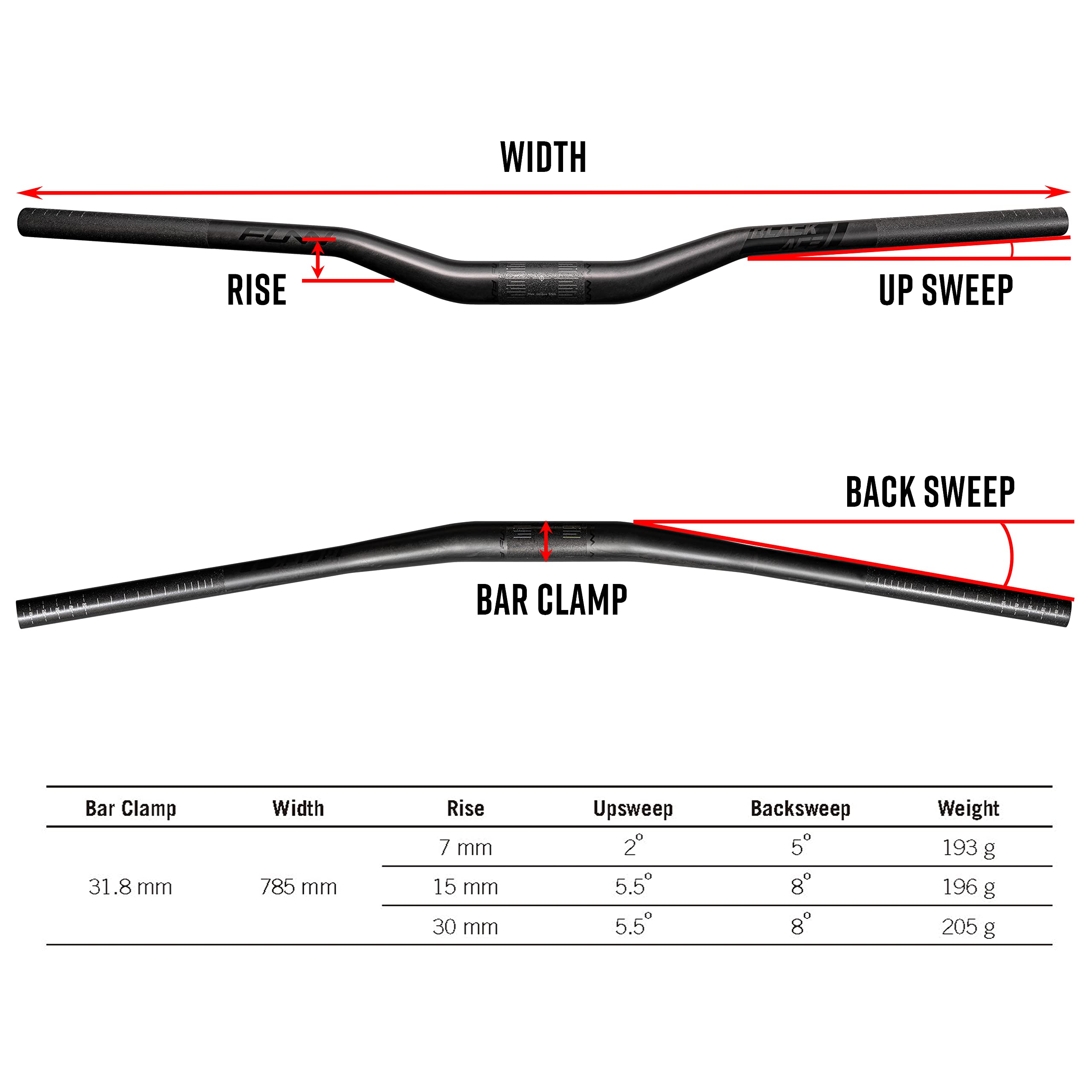 7mmライズの場合、アップスイープは2°で、バックスイープは5°です。15mmと30mmライズの場合、アップスイープは5.5°、バックスイープは8°です。