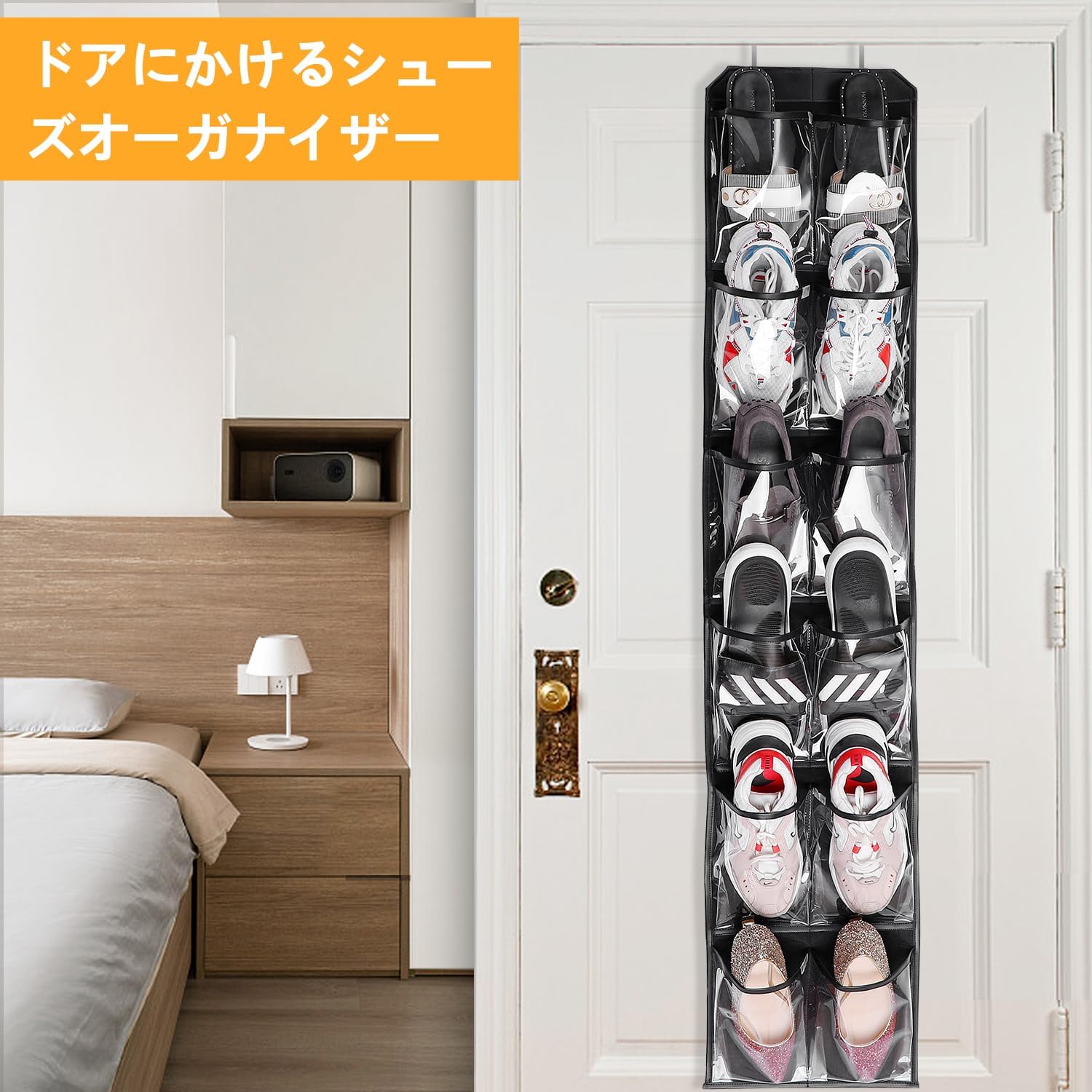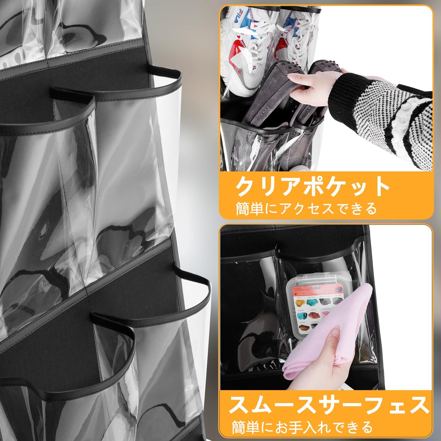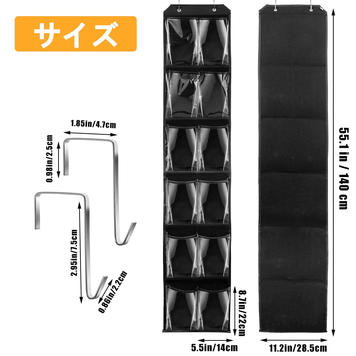 ウォールポケット 壁掛け収納 ア掛け収納式ポケット 6段の大容量 透明窓付き 吊り下げ収納ポケット 不織布 頑丈 耐用 小物収納 タオル 化粧品 おもちゃ リモコン 雑誌 書類/漫画などの収納 フック2個付き・展示用 12ポケット (黒)