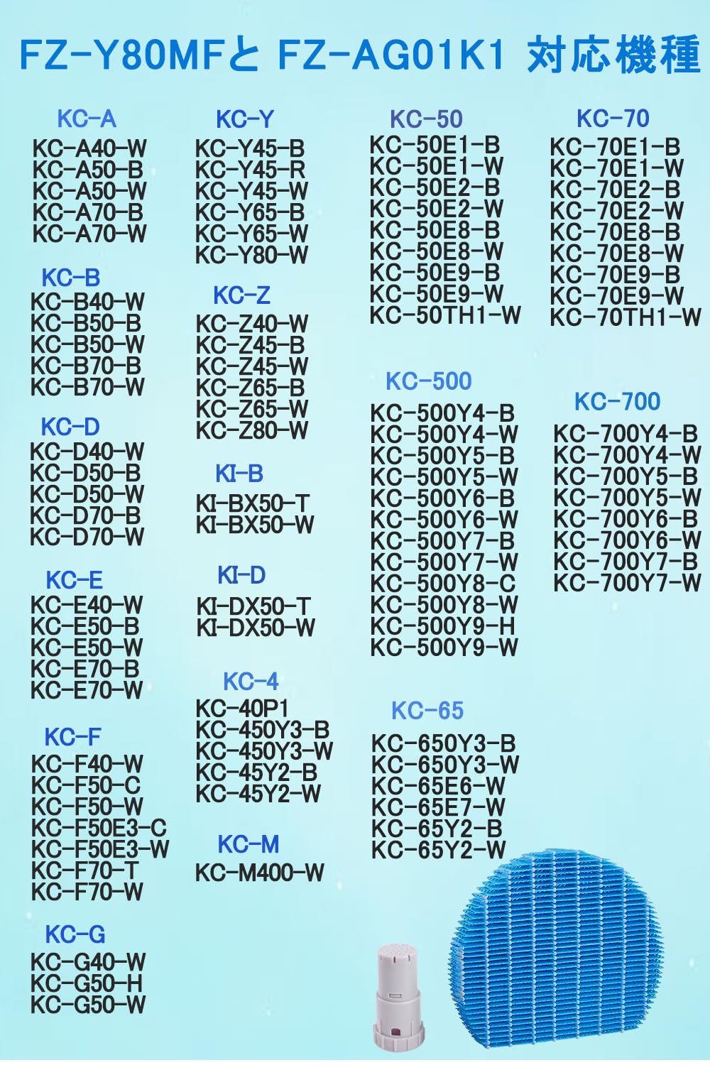 形名: FZ-Y80MF 加湿フィルター と FZ-AG01K1 イオンカートリッジ 材質:ポリエステル・レーヨン・プラスチック、ABS、Ag+イオン 梱包物:FZ-Y80MF1個、FZ-AG01k1 イオンカートリッジ1個 FZ-Y80MF本体サイズ:19*22*3 CM FZ-AG01K1 サイズ:3.6*3.6*7cm お手入れ目安:1カ月に1回、水洗いする。分解しないで洗ってください。 交換目安:約10年。交換の目安説明:1日8時間加湿空気清浄した場合。ご使用状況や洗い方によっては交換時期が早くなることがあります。定期的(1ヵ月に1回程度)にフィルターのお手入れが必要です。