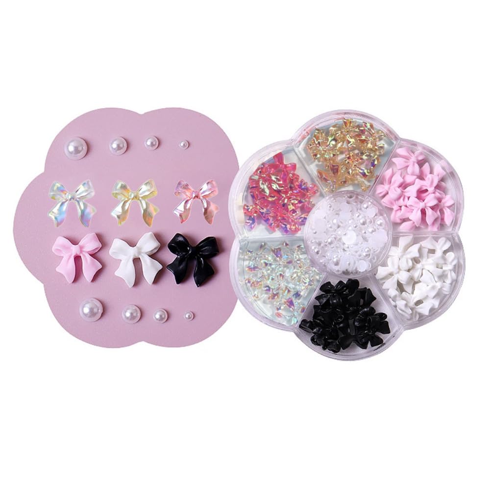 ネイルパーツ リボンセット カラフルガーリーリボン 全6色 10個/色入り オーロラ クリア 半円 パールストーン(ホワイト) 立体 可愛い 手作りアクセサリー