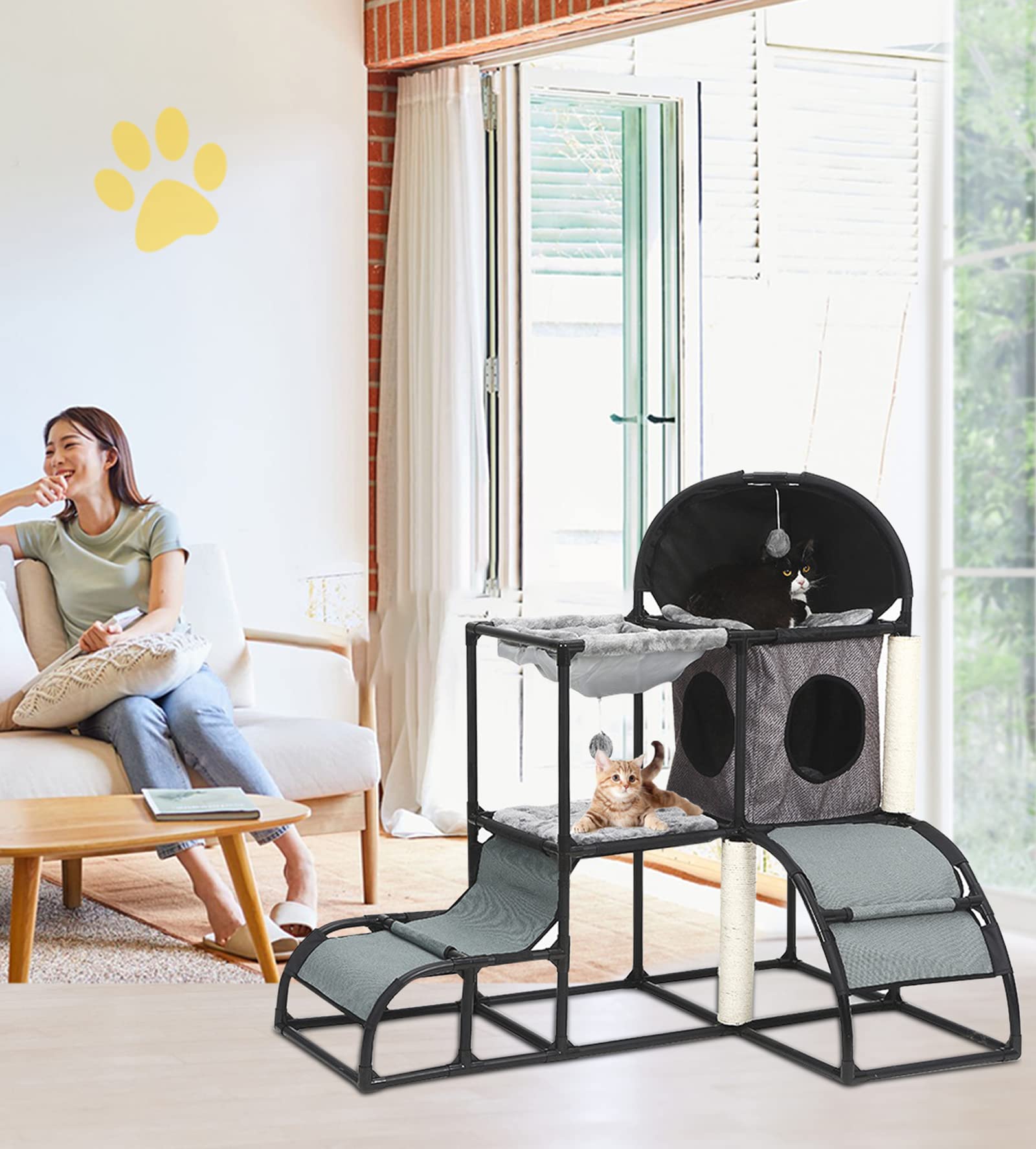 Haskoss 猫爬架 キャッキャットタワー 木製 キャットタワ 猫 キャットタワーキャットタワー 突っ張り 猫 タワー スリム 大型猫 据え置き 省スペース ハンモック 見晴台 ねこハウス 猫おもちゃボール ボンボン 麻紐 爪とぎ 運動不足解消 多頭飼い ベージュ 高さ114m