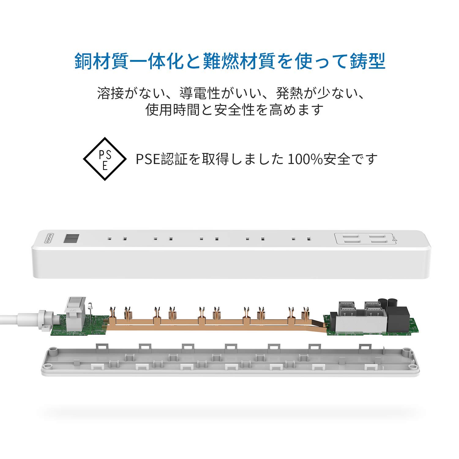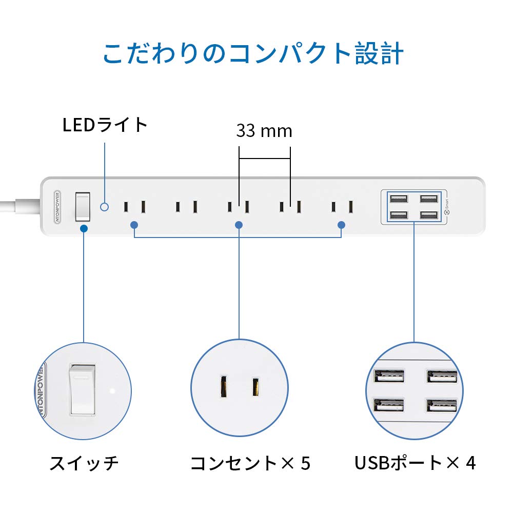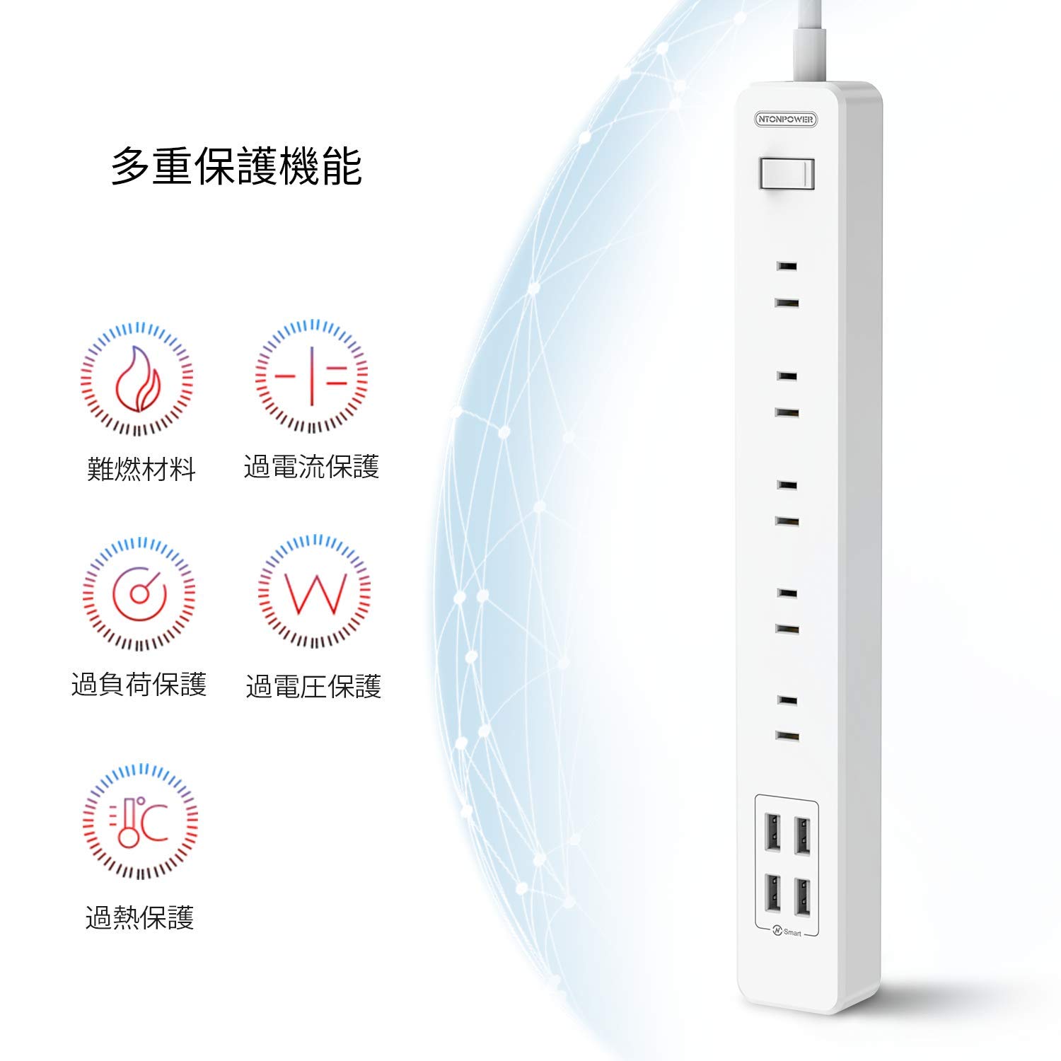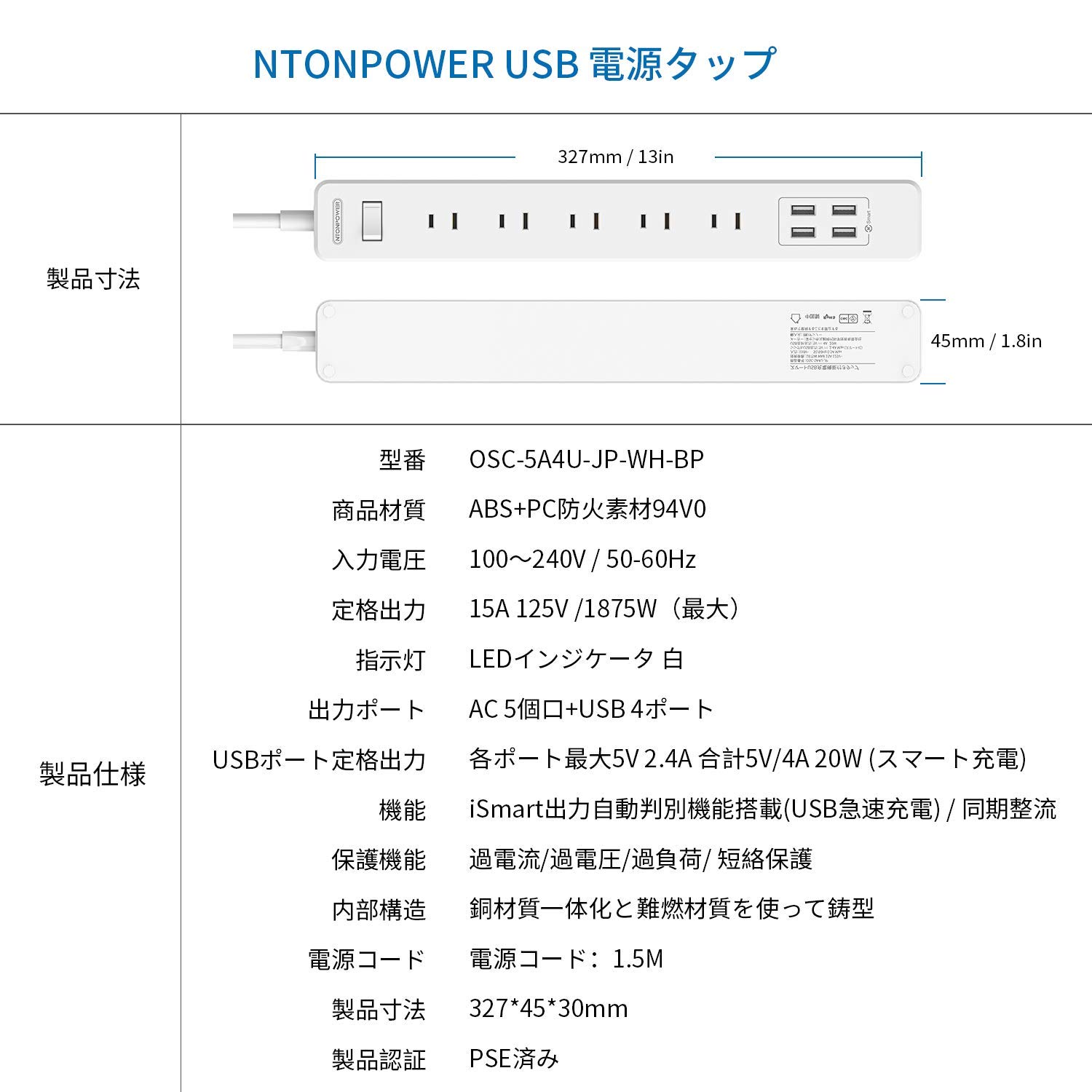 NTONPOWER 電源タップ USBコンセント マルチタップ AC差込口 4USBポート(2.4A/ポート)急速充電 省エネ 一括電源スイッチ 1500W PSE認識済み 延長コード1.5m 卓上タップ オフィス/家庭充電用 - ホワイト (5個口)