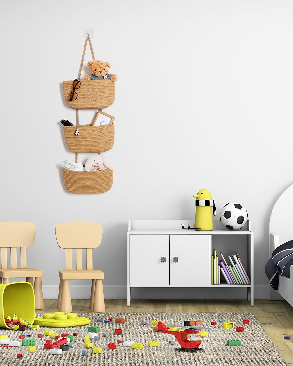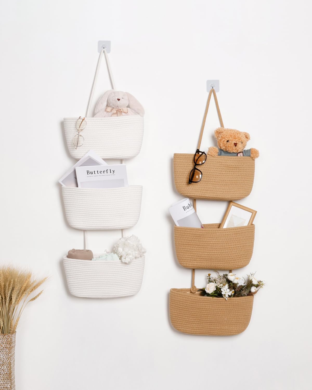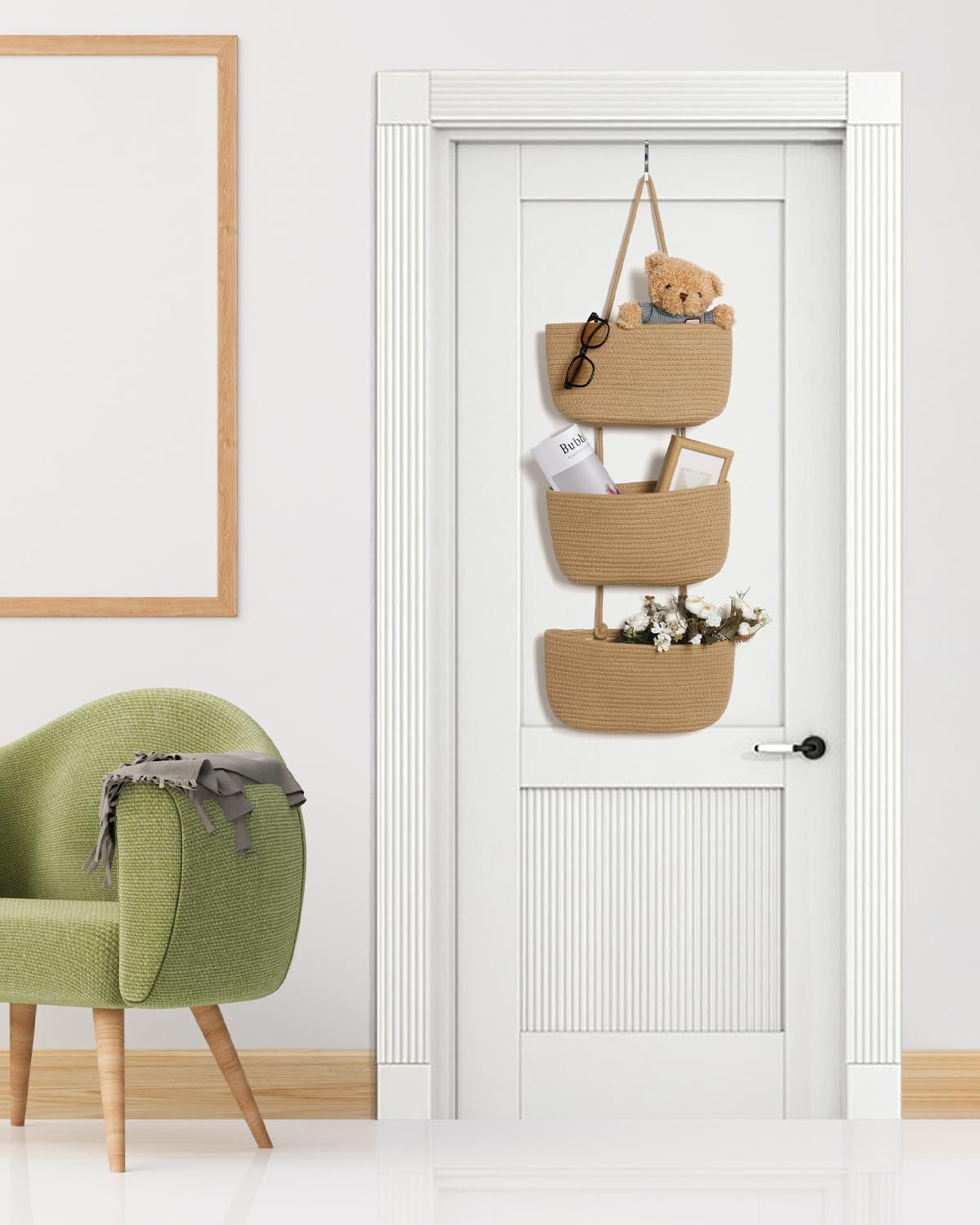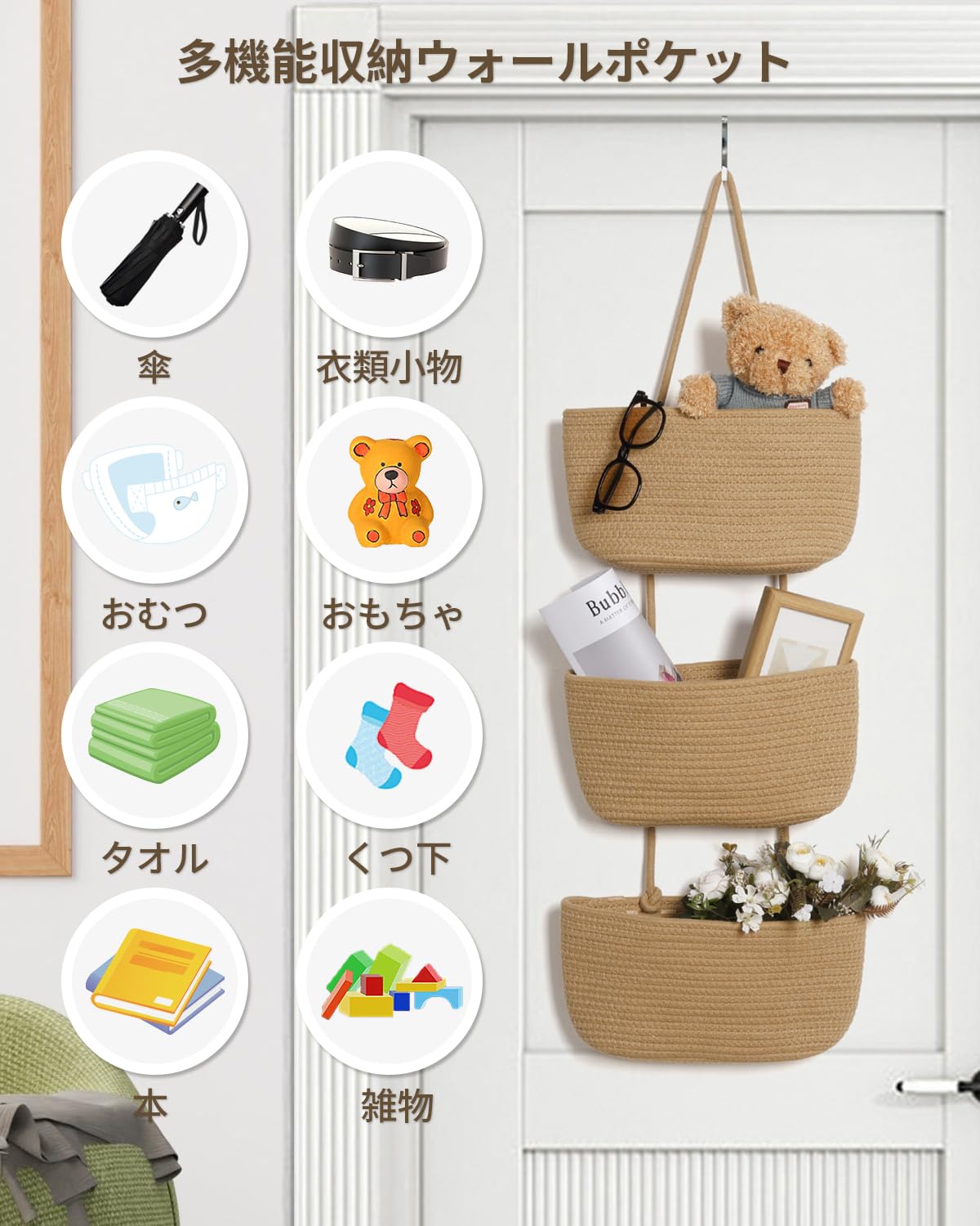 Umlaca ウォールポケット 吊り下げ収納 3ポケット 綿麻製 折りたたみ式 ハンギング収納袋 フック付き | ドア掛け 壁掛け収納 小物入れ クローゼット 洗面所 寝室 キッチン収納 整理整頓グッズ カーキ