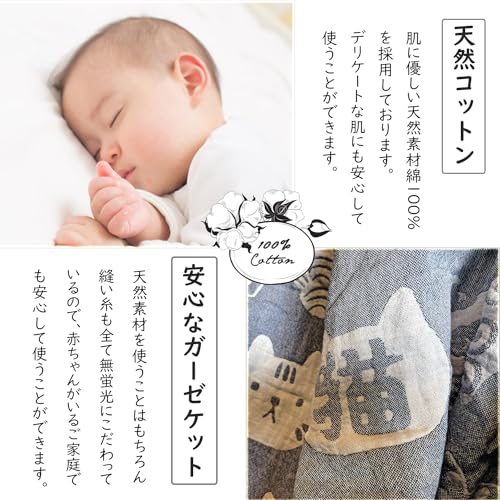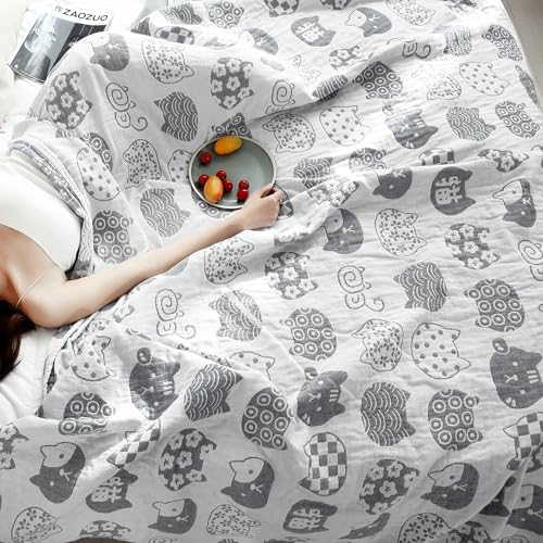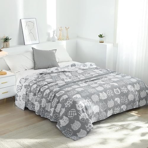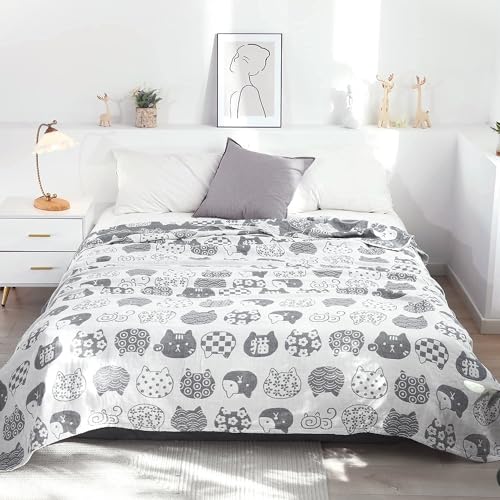 Vanxing ガーゼケット シングル 4重ガーゼ 天然綿100% 吸湿 通気 夏快眠 肌に優しい 年中快適 丸洗いOK 軽量 リバーシブル 150x200cm (猫顔柄・グレー)