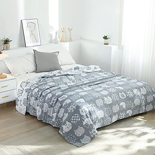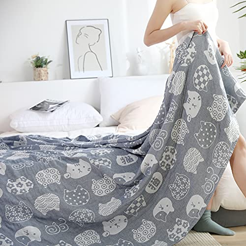 Vanxing ガーゼケット シングル 4重ガーゼ 天然綿100% 吸湿 通気 夏快眠 肌に優しい 年中快適 丸洗いOK 軽量 リバーシブル 150x200cm (猫顔柄・グレー)