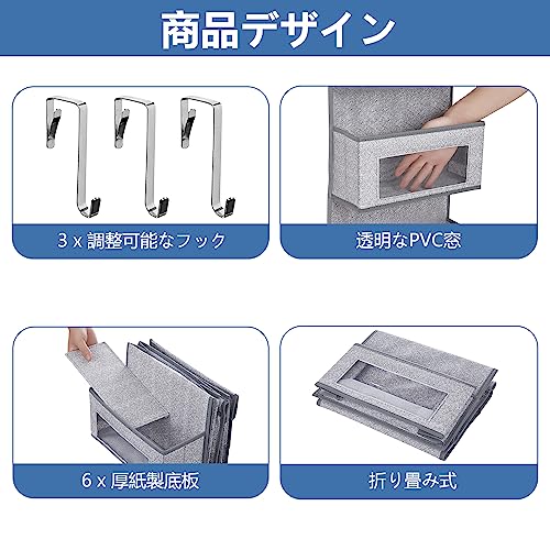 ウォールポケット Yonace ドア掛けポケット 透明窓付き 6段の大容量 壁掛け収納ポケット 吊り下げ収納ポケット 頑丈な不織布 耐用 小物収納 おもちゃ バッグ タオル 本 書類などの収納 3x弾性フック付き(グレー)