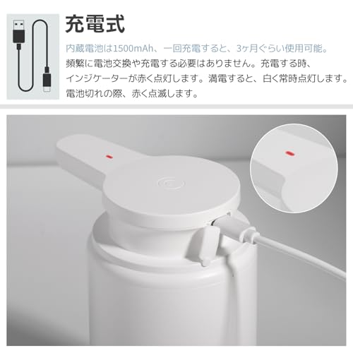 Uarnicey 自動 ディスペンサー 液体 食器用洗剤 シャンプーディスペンサー 吐出量4段階調节 壁掛け 充電式 500ml容量 IPX5防水 キッチン 洗面所などに適用 (ホワイト+ブラック)