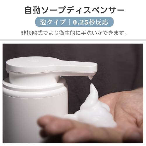 ソープディスペンサーセンサー付き、PRINSFIL自動泡、吐出量4段階調、380ml、壁掛け オートディスペンサー、充電式、IPX5防水性能、キッチン 洗面所などに適用 (ホワイト、泡タイプ)