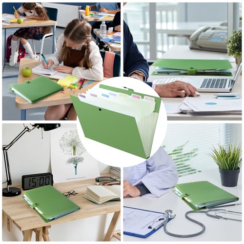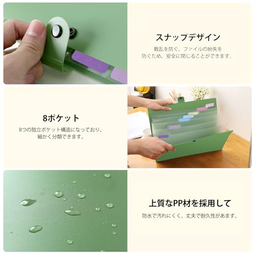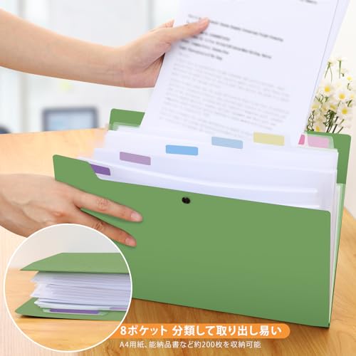FRETONBA ドキュメントファイル 8ポケット A4 拡張フォルダー スナップ式 ジャバラファイル 区分けラベル付き 防水 分類収納 透明仕切り プリント整理 書類整理ボックス 多機能 書類ケース 軽量 持ち運び可能 (8 ポケット 1個入り, グリーン)