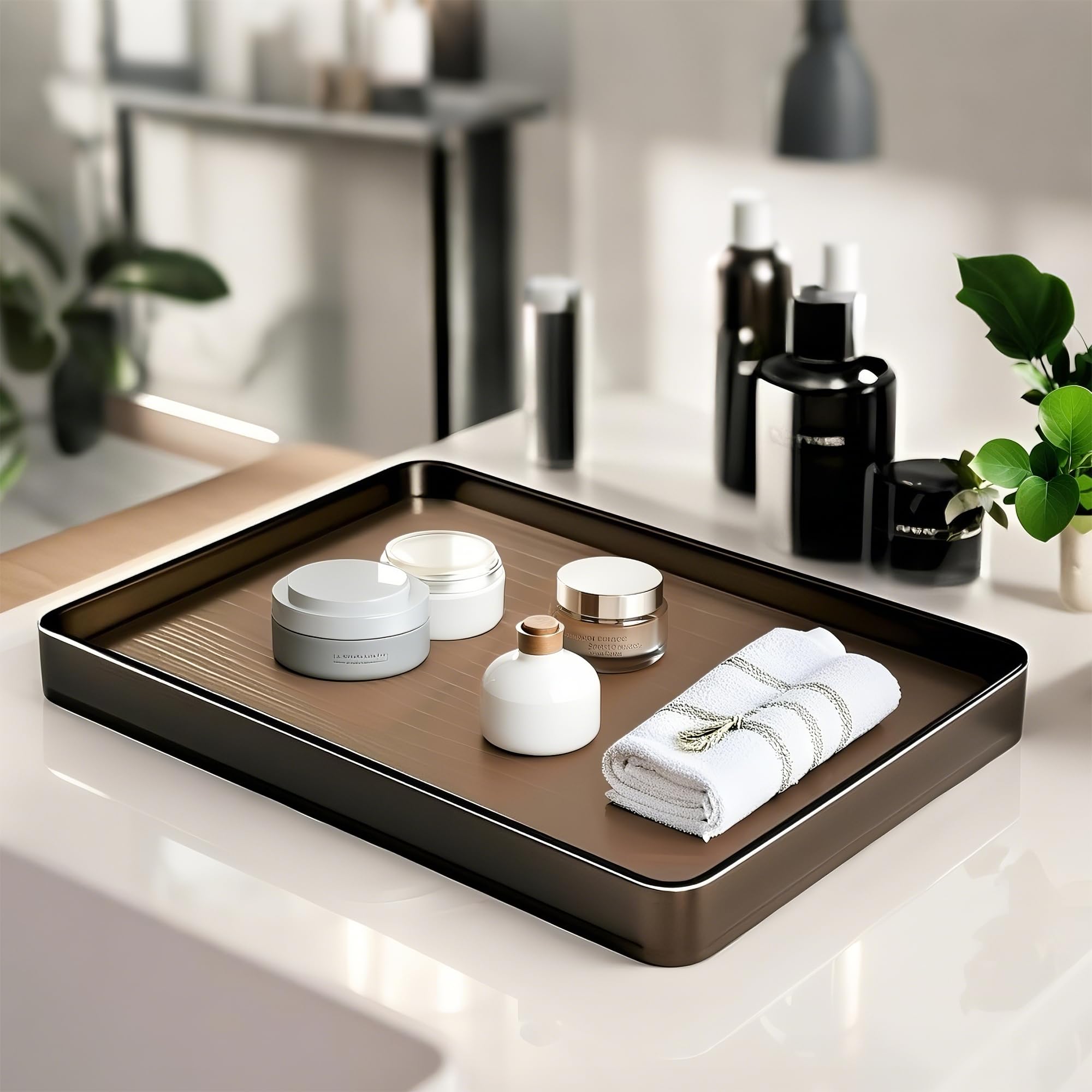 KInGSUnSおしゃれ 装飾 サービングトレー 厚い 金属 おぼん トレー 滑らない 大きい 浅型長方形トレイ キャンドル タオルとスパ用品収納 お盆 トレー 浴室/洗面台/ホテルのバスルーム対応 ダークブラウンとゴールド ギフ ト包装 新築祝い や記念日などのシーンに最適です 35.3×25.5×3.1cm