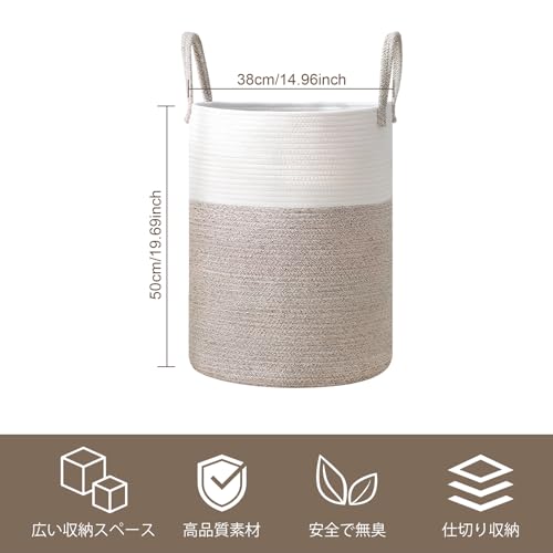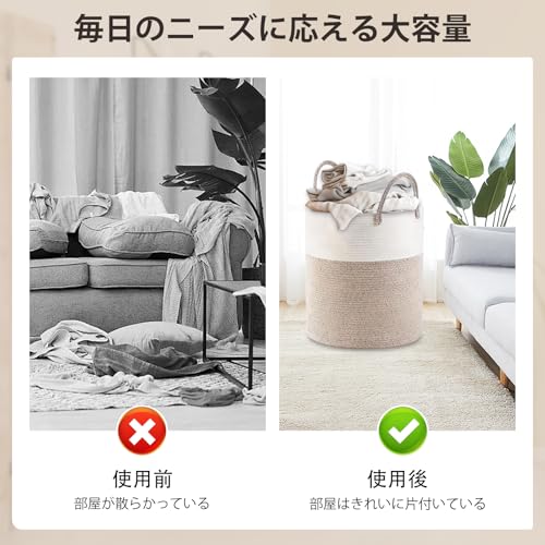 60L 収納バスケット 布 ランドリーバスケット 収納カゴ コットン コットンロープ 収納 衣類 収納 ランドリー かご インテリア バスケッ 物入れ 洋服 鉢カバー ハンドル付き 持ち手付き 大容量 積み重ね 編み込み ストレージ おもちゃ 省スペース 38x50cm
