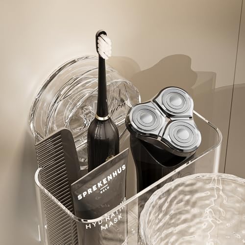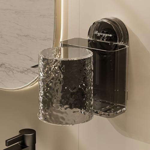 歯ブラシスタンド 浮かせる (強力真空吸盤/多機能収納) うがいコップ 歯磨きコップ 一体化 洗面所 衛生的 歯ブラシ&剃刀収納 すっきり整理 (ブラック)