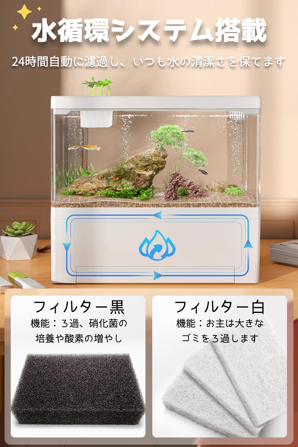Yjhyuxi 水槽 セット 小型 アクアリウム【インボイス制度登録店】メダカ飼育水槽 フルセット 静音 USB式で省エネ LEDライト付 底部濾過システム搭載 フィルター付 初心者にやさしい ベタ/金魚/熱帯魚 卓上用 取扱説明書付(ホワイト,L)