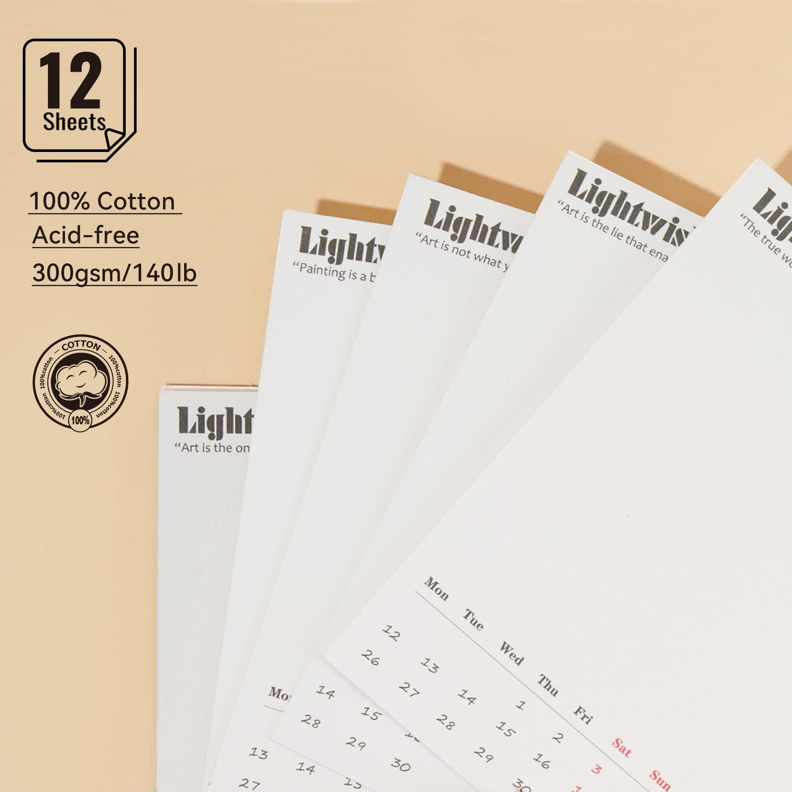 LIGHTWISH 2026 プロフェッショナル水彩用カレンダー紙 - 100% 綿製、300gsm 無酸、細目 - アーティスト向け・精密描写・ミニアチュアアート 12 枚入