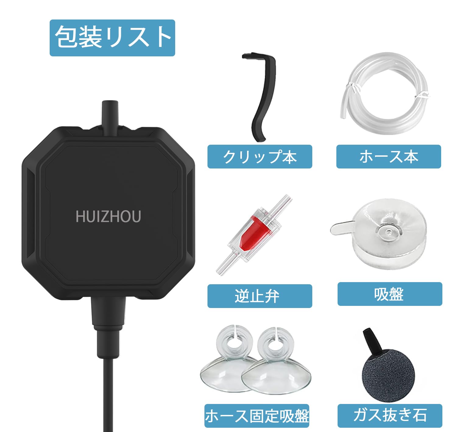 HUIZHOU 水槽エアーポンプ 1.5W 小型エアーポンプ 省エネ 低騒音 水族館 熱帯魚 アクアリウム 観賞魚 飼育 部品がそろっていて、3種類の固定方式