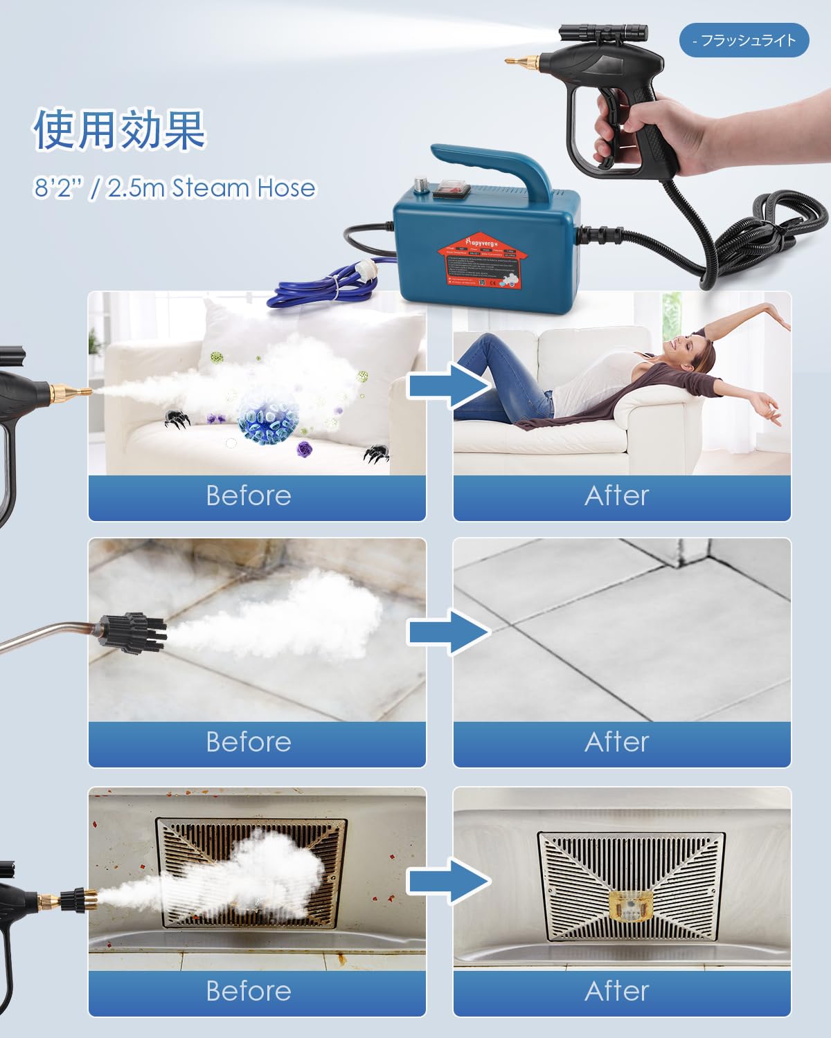 Hapyvergo スチームクリーナー 高温蒸気洗浄機 洗剤弁用可 1600W強力作動 20S速熱 大容量水タンク 105℃高温除菌 豊富なアクセサリー 家庭用高圧洗浄機 キッチン/レンジフード/調理台などに適用 コンパクトサイズ 日本語説明書