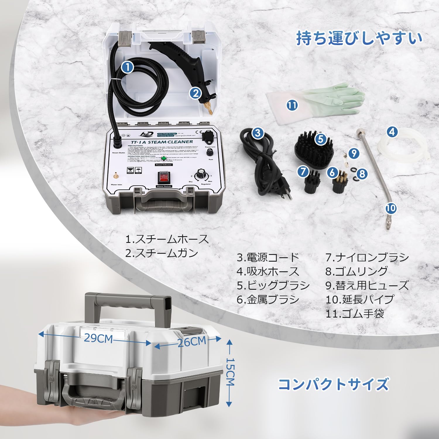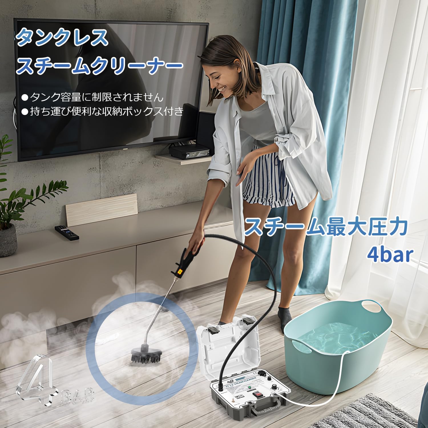 Moongiantgo スチームクリーナー 蒸気洗浄機 高温蒸気噴射 20秒で蒸気排出 連続スチーム ポータブル 収納ケース付き 湿度調節可能 バケツから給水 片手で持ち上げる 部屋/窓/キッチン/トイレ掃除機 小型軽量 日本語説明書