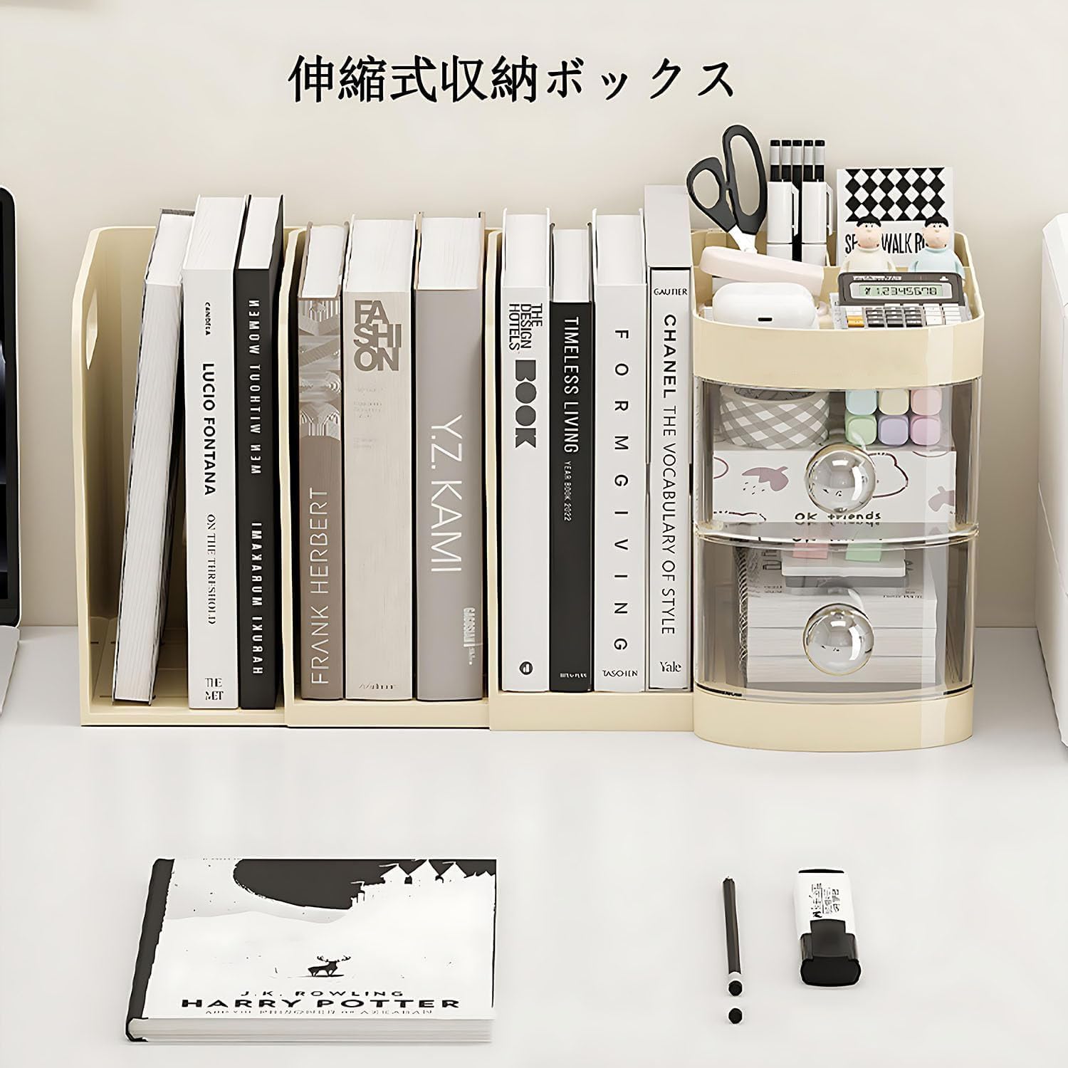 Vinnatsu卓上収納 デスク上置き棚 ペン立て付き 引き出し 大容量 卓上ラック デスクオーガナイザー 机上ラック 本立て 本棚折りたたみ式 伸縮できるブックエンド 倒れない 書籍 A4ファイル収納 小物収納 (クリームホワイト)