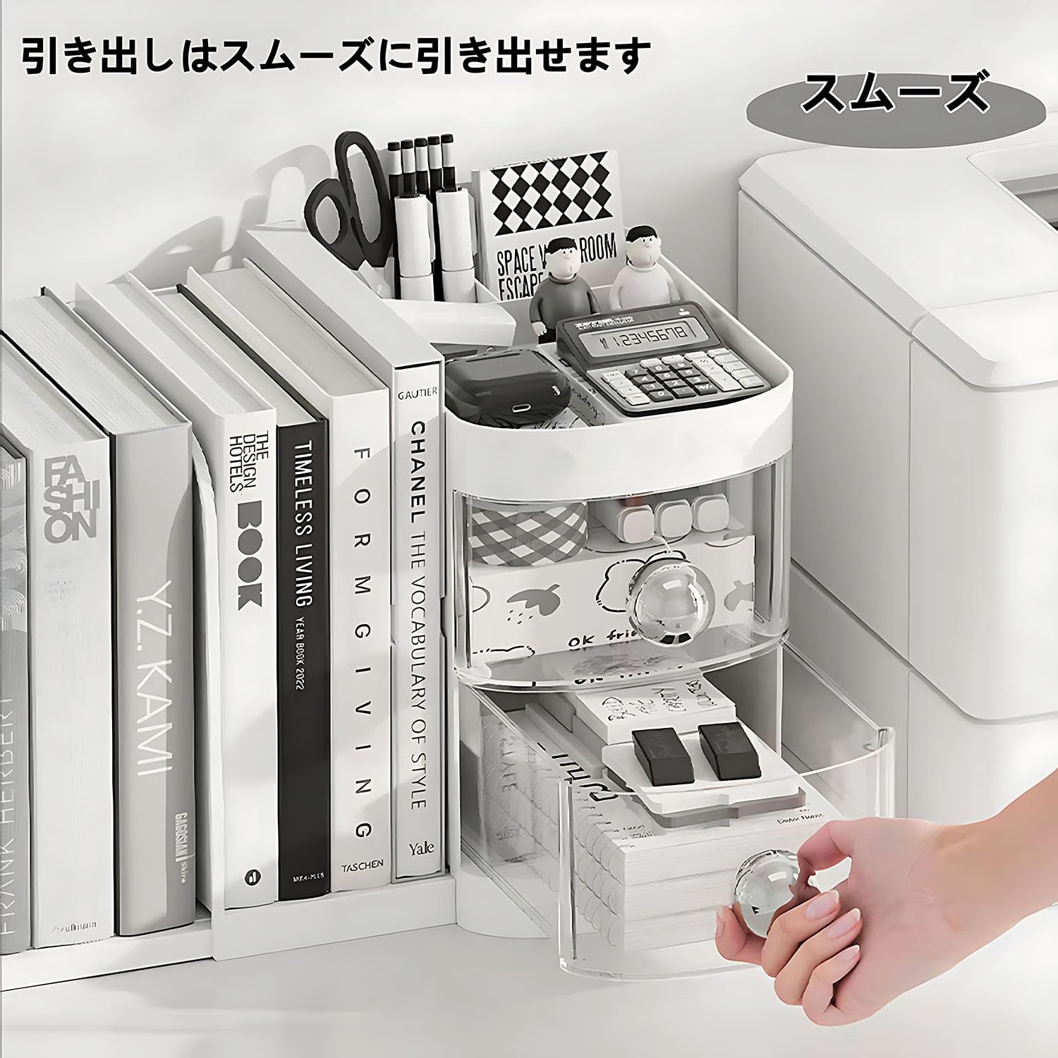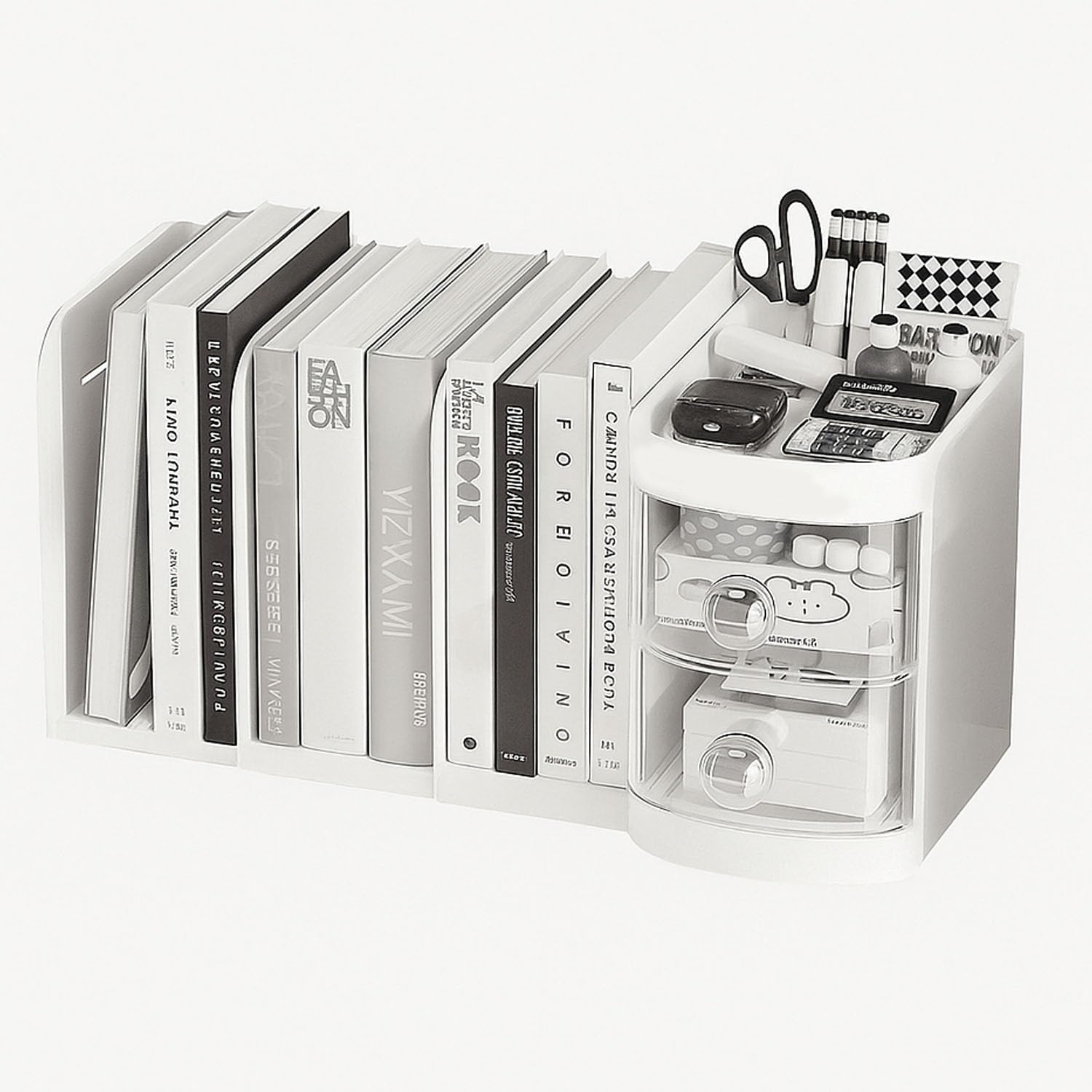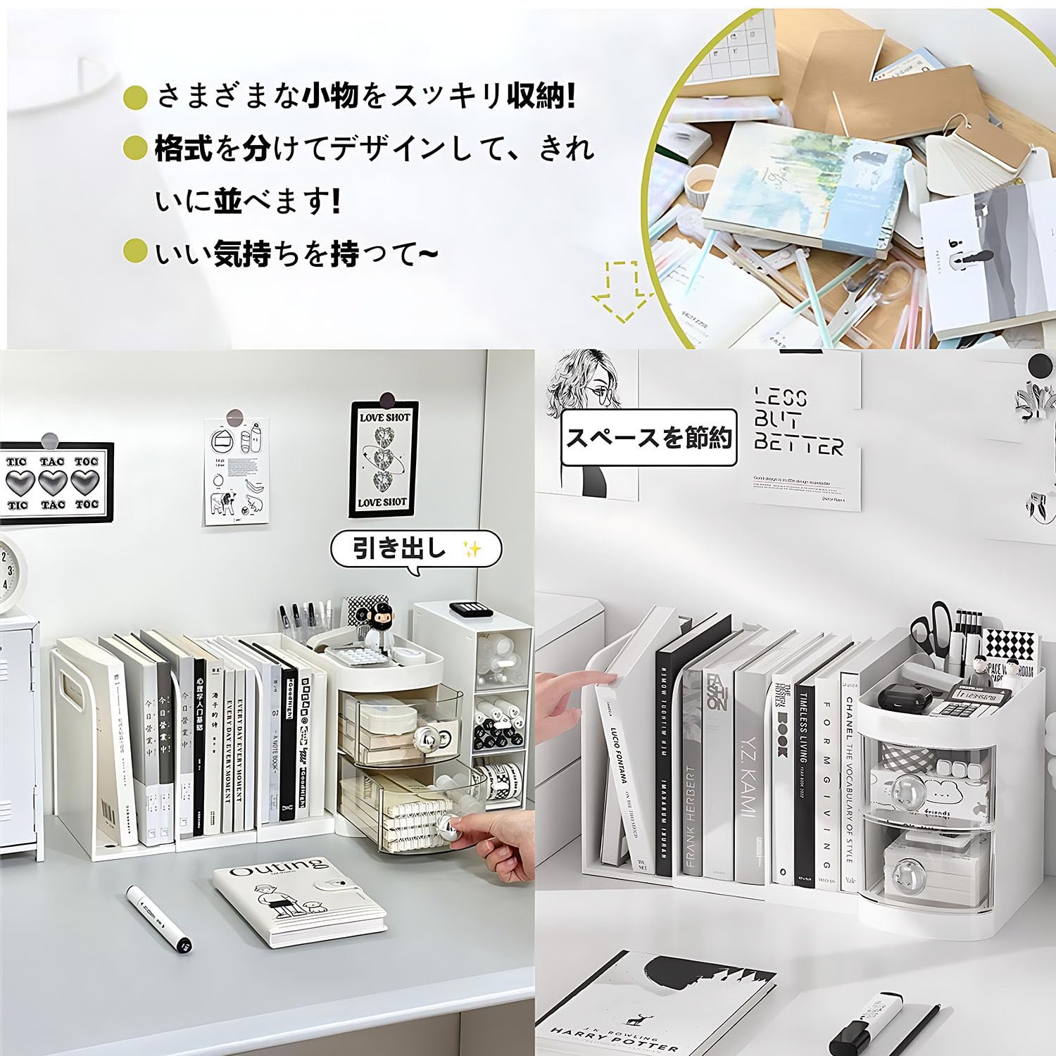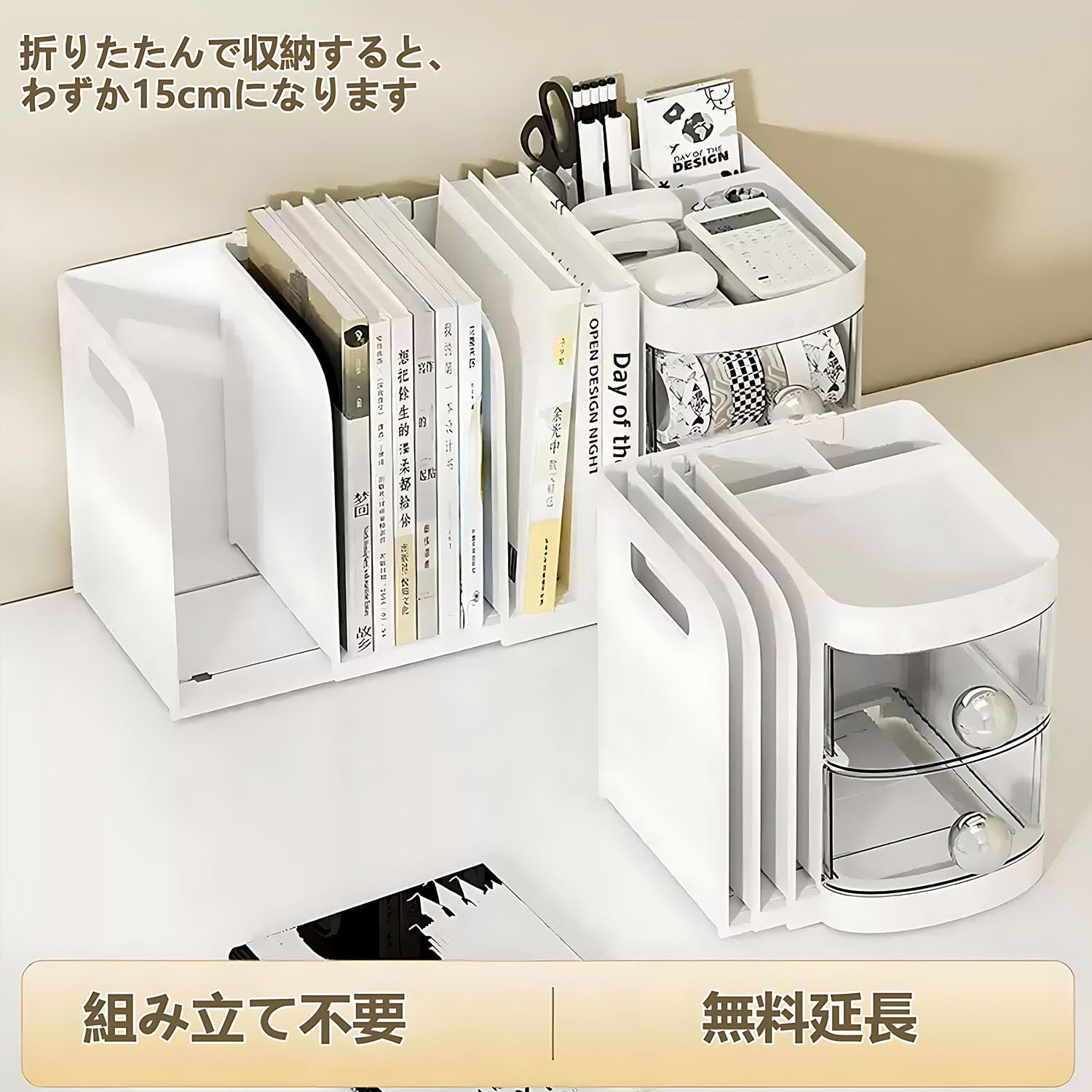 Vinnatsu卓上収納 デスク上置き棚 ペン立て付き 引き出し 大容量 卓上ラック デスクオーガナイザー 机上ラック 本立て 本棚折りたたみ式 伸縮できるブックエンド 倒れない 書籍 A4ファイル収納 小物収納 (しろい)