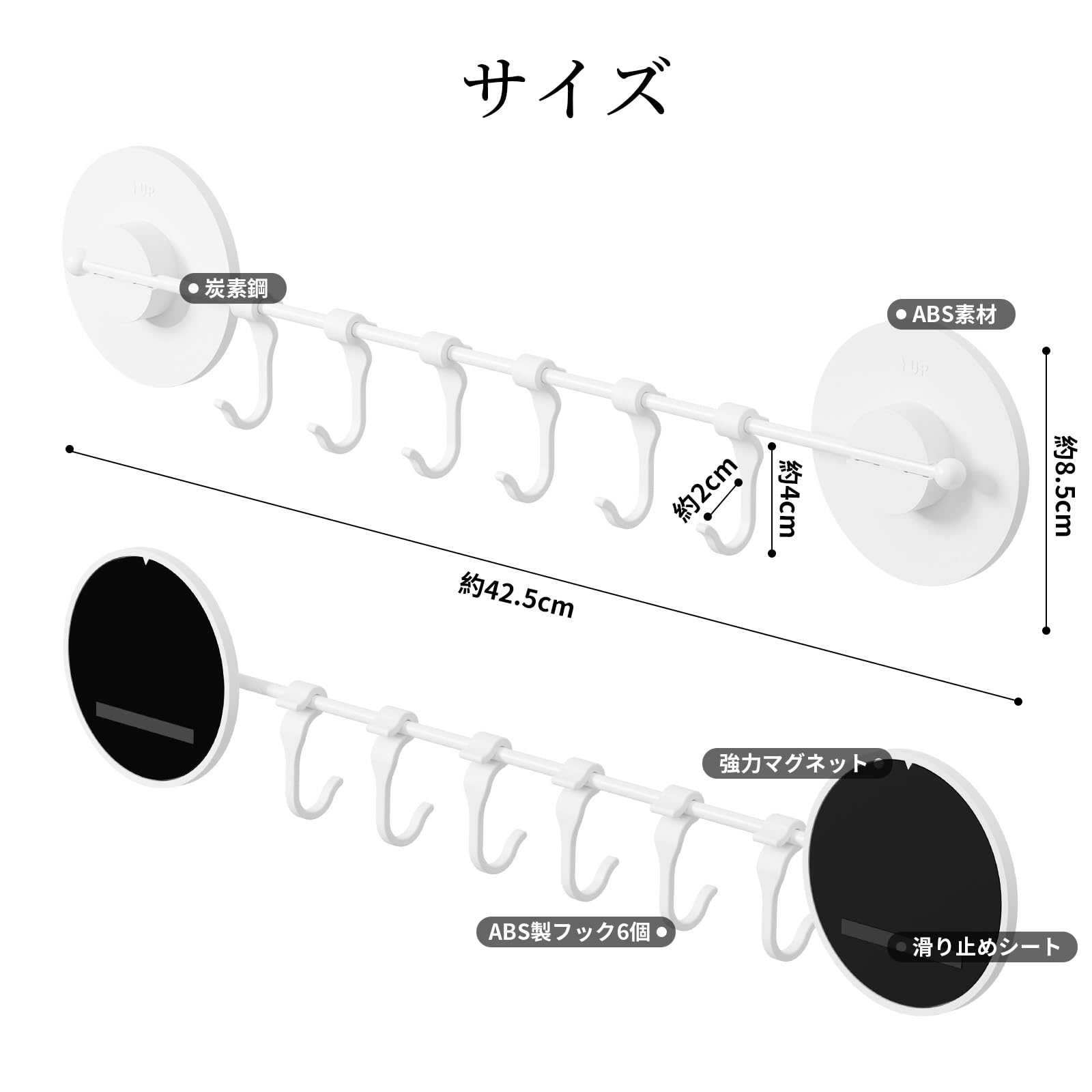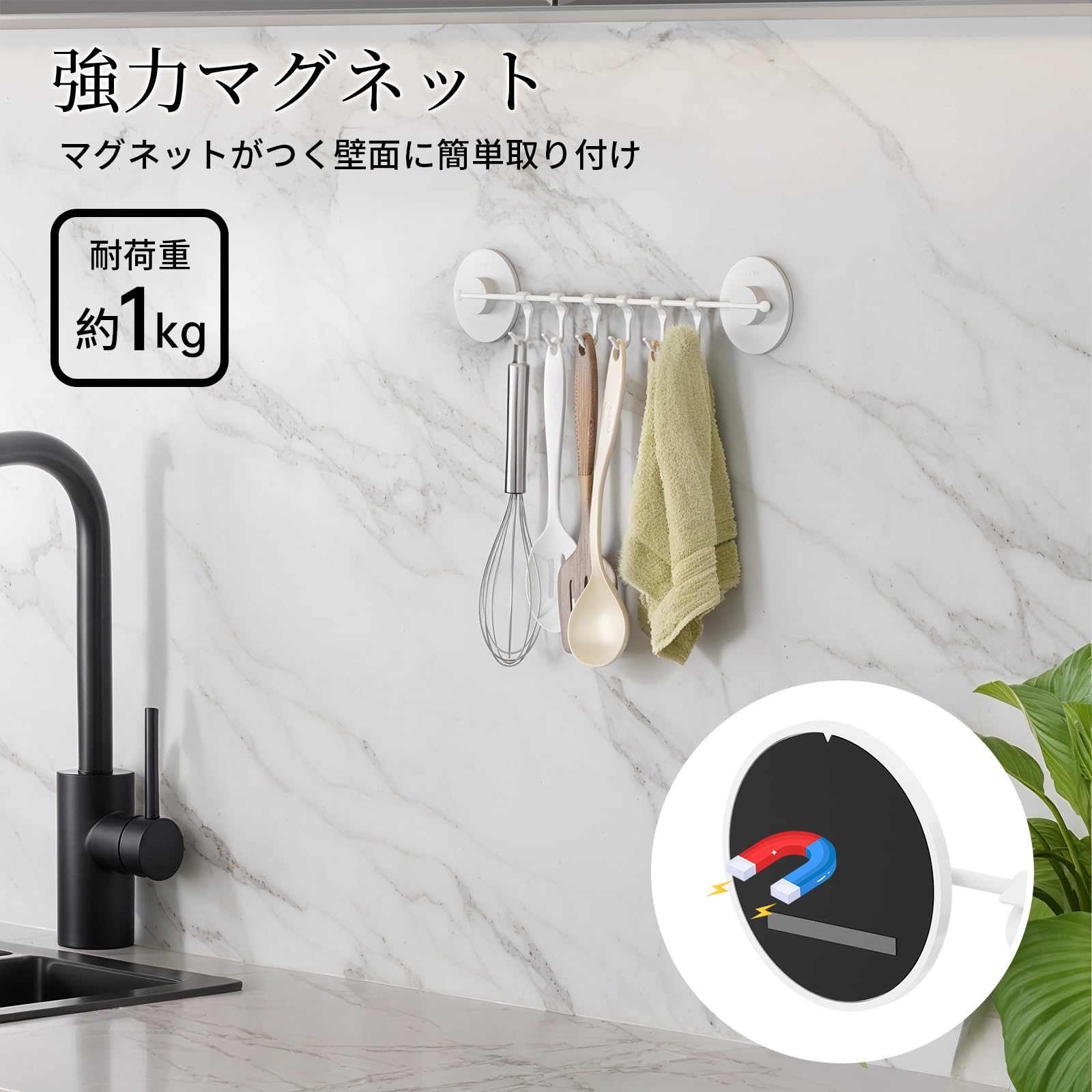 Toski キッチンツールフック マグネット 壁掛け バスルームラック 6個可動フック付き 42cm 穴あけ不要 取り付け簡単 器具 タオル 収納 キッチン 浴室 冷蔵庫 レンジ 玄関 省スペース ホワイト