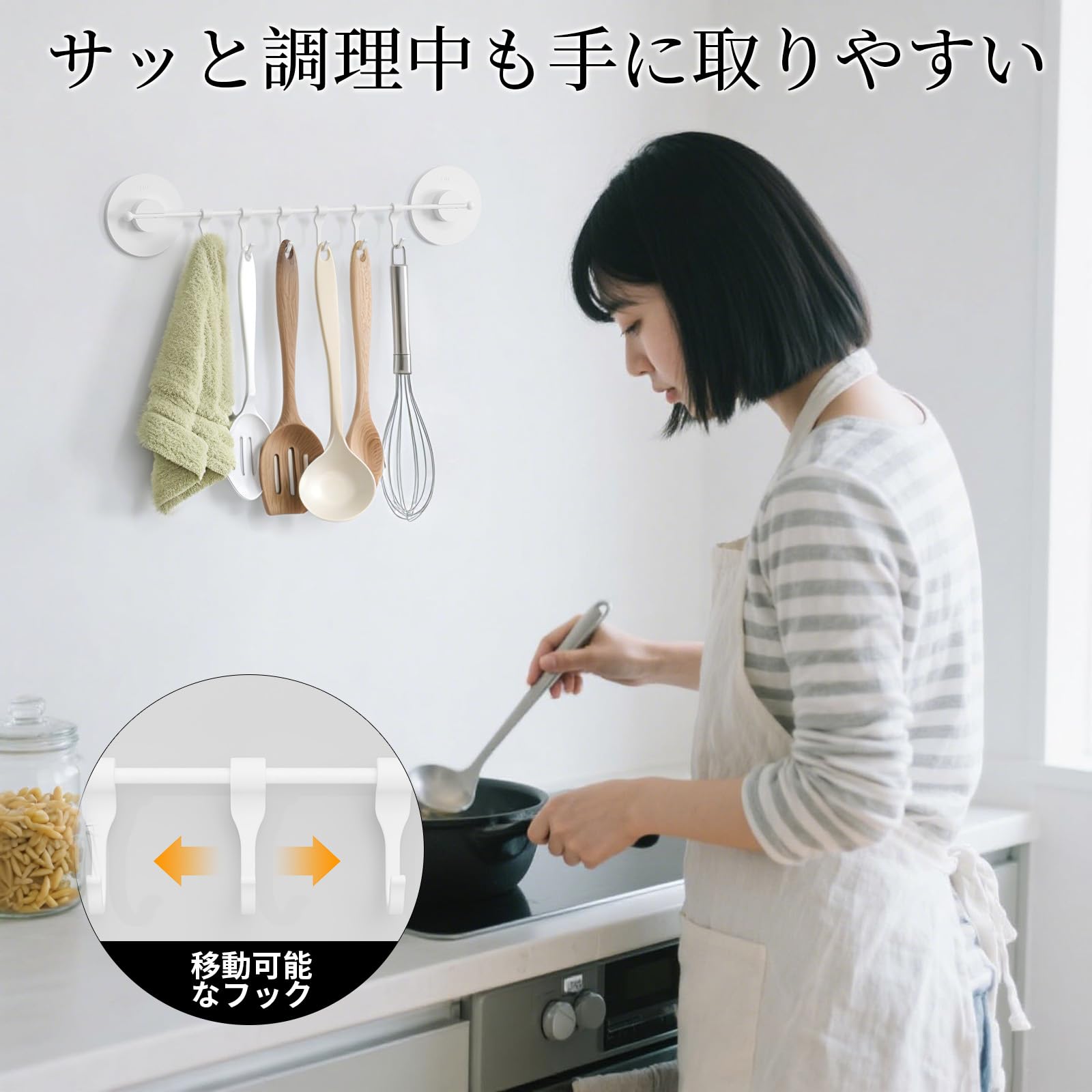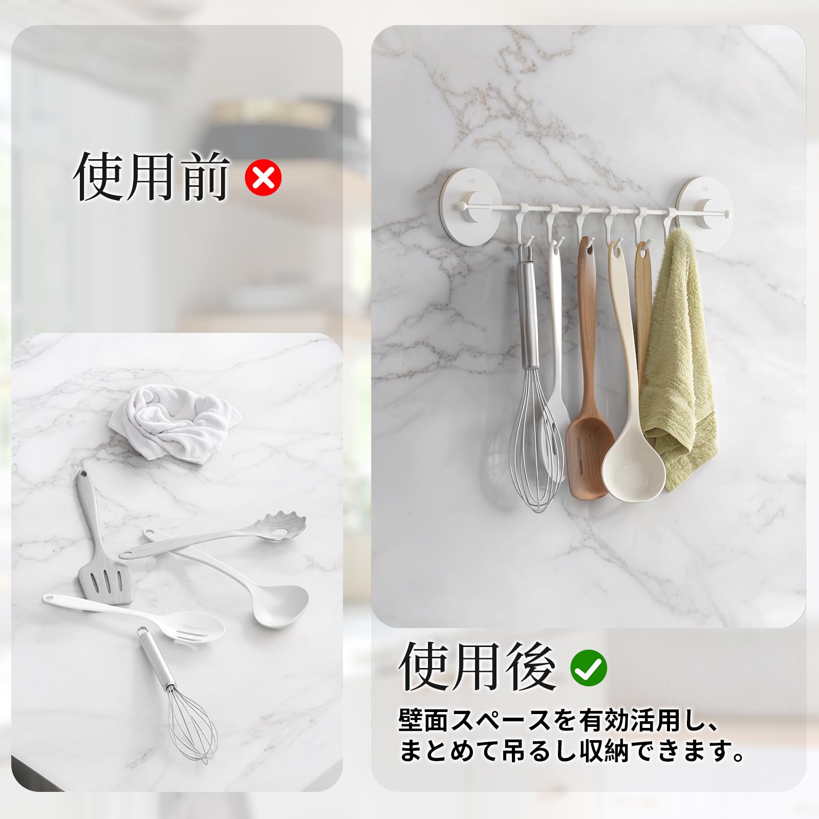 YipuVR キッチンツールフック 壁掛け 強力吸盤 台所 収納 キッチン収納 防水防錆 高耐荷重 取り外し可能 鍋蓋置き 壁を傷つけず穴あけ不要 ダブルバー 6個可動式フック 30cm 金属 アルミニウム (ミルクホワイト)