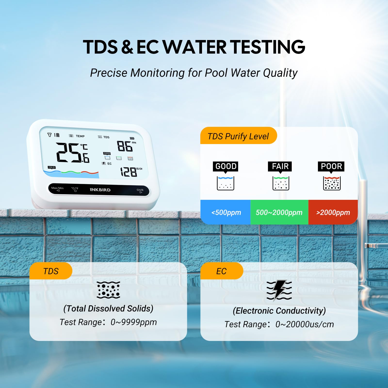 INKBIRD IBS-P04R 風呂水温計 ソーラーパワー ワイヤレス プール温度計 3 in 1 水温、TDS水質値、EC水質値検出 防水温度計 デジタル 超長距離ワイヤレス伝送 屋内ディスプレイ付き プール、水槽、浴槽、スパ、池、温泉に適しています