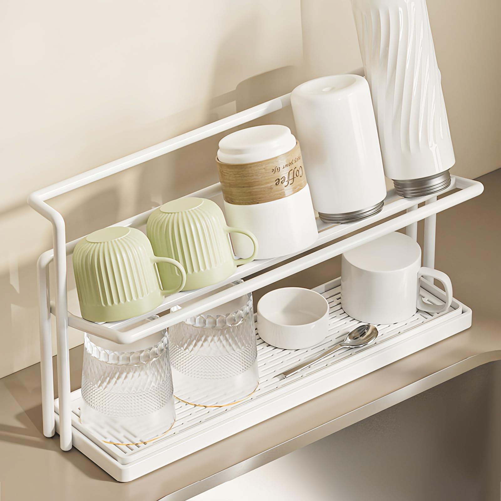 キッチンドレンラック カップ収納ラック 水切りラック キッチン収納 二段 ティーカップトレイ 組み立てが簡単 キッチン棚 おしゃれ (ゴールド)