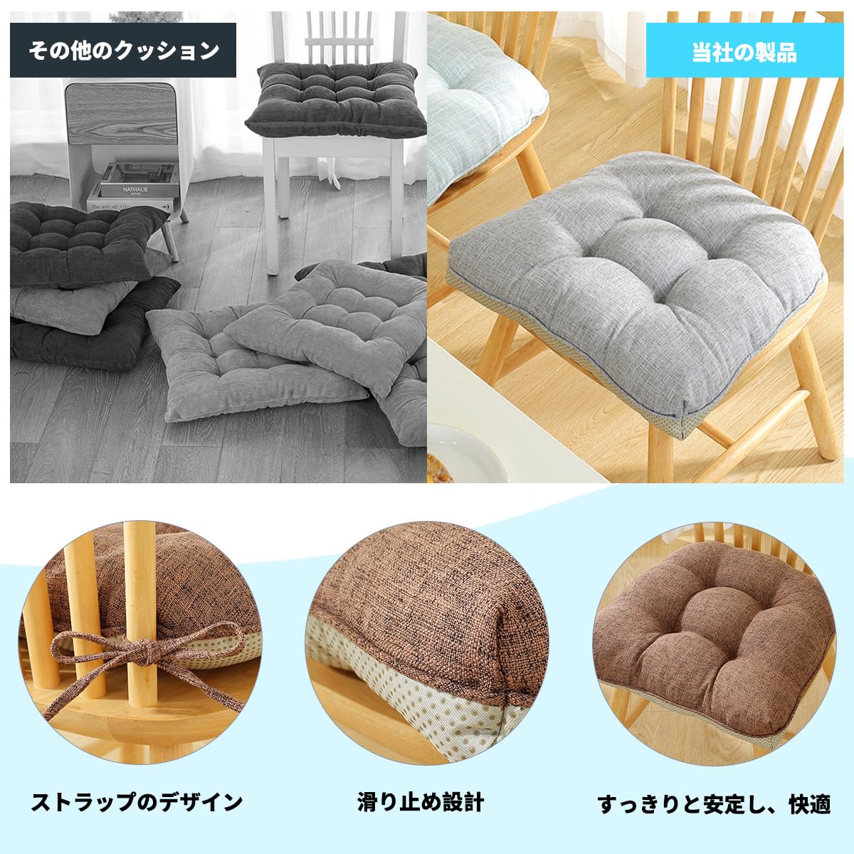 Aikenn 綿と麻の素材、クッション、パールコットンの詰め物、固定針技術、滑り止めストラップ、複数のシーンに適し、長時間快適に座れる、クッション、ストラップ付きの厚手のチェアクッション、2個セット、ふわふわ、ふわふわ、洗濯機洗い可能、二重滑り止め、四季対応ダイニングチェアクッション、46x43x9 cm (1, ダークグレー)