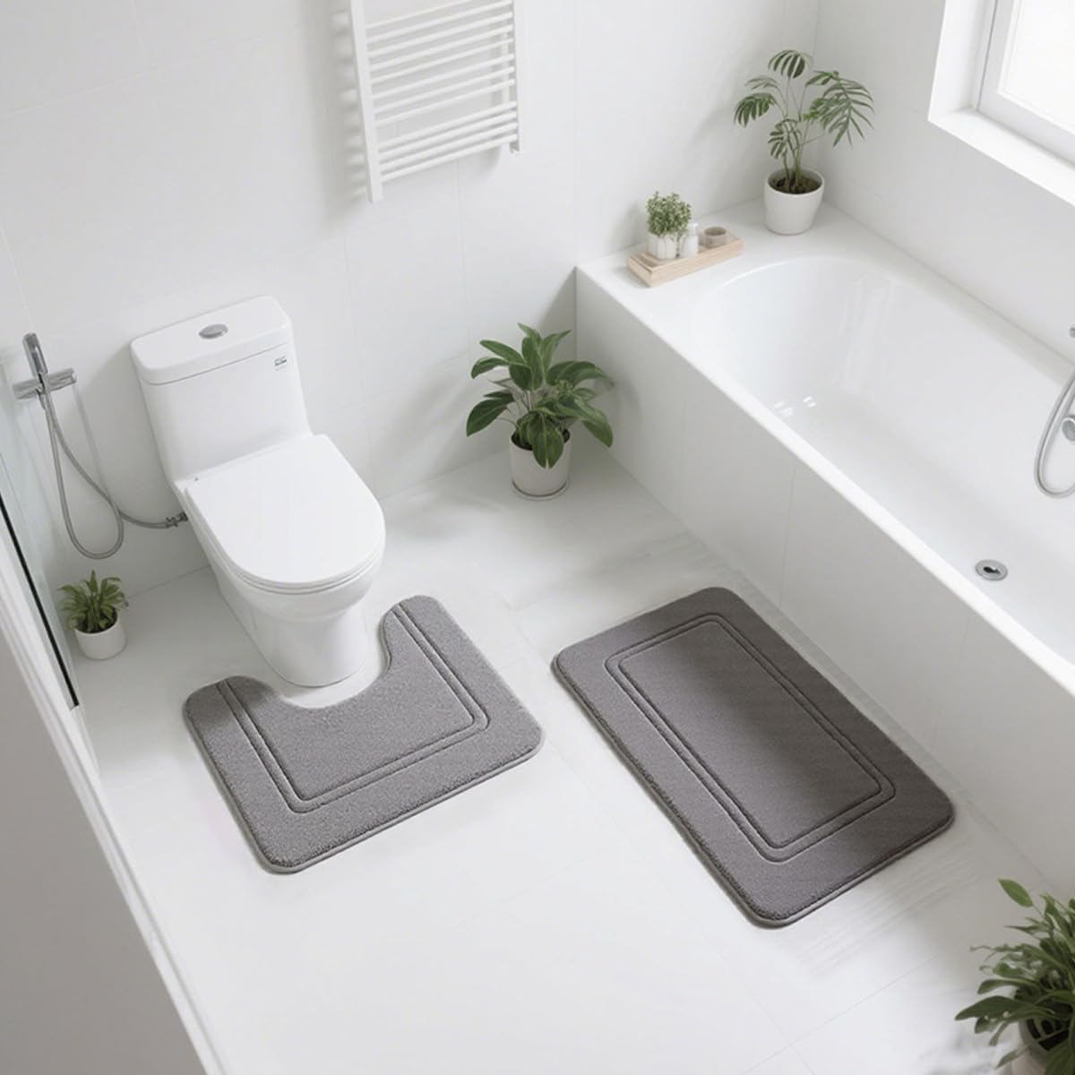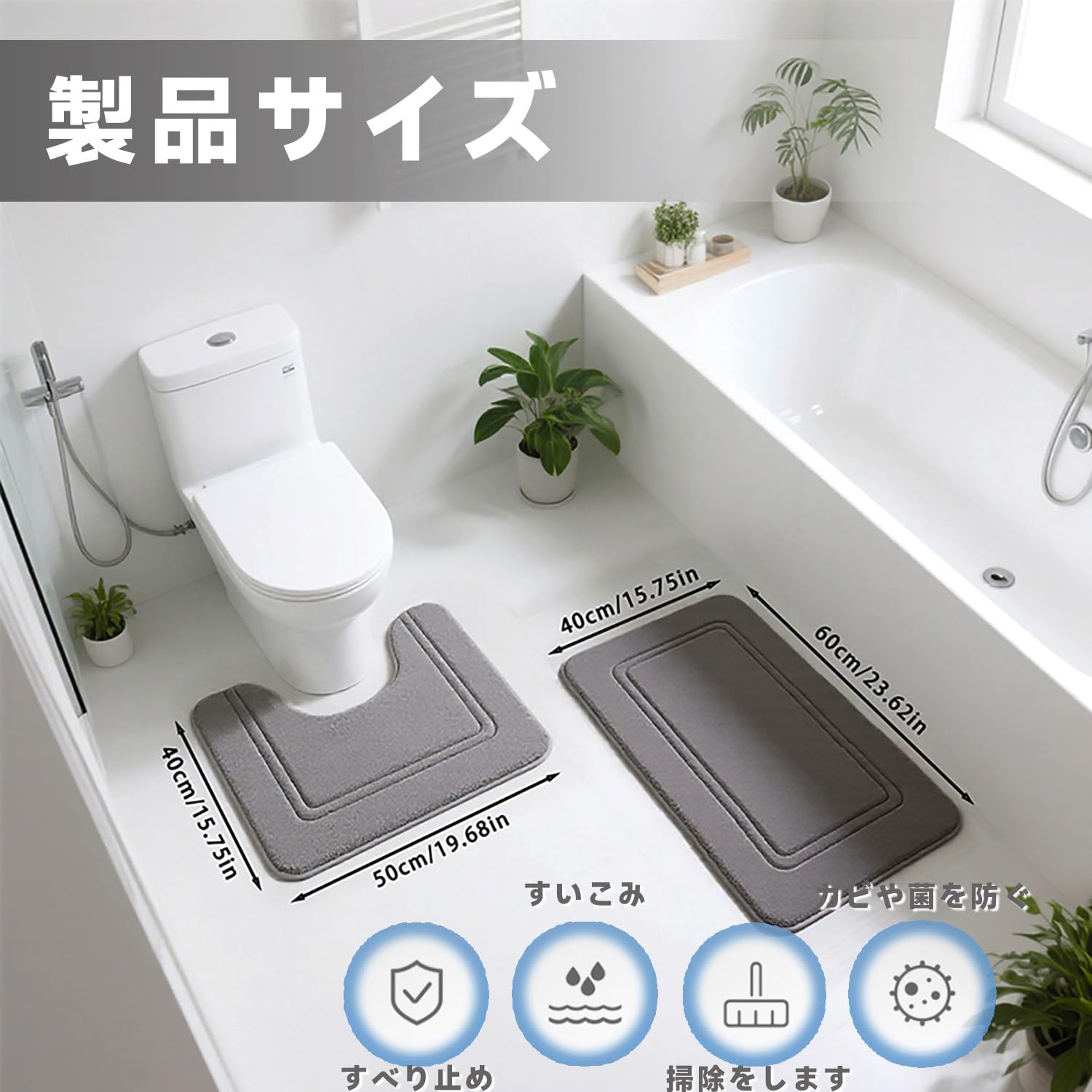 Aikenn浴室滑り止めフロアマットセット:U字型トイレマット+長方形フットマット。吸水性、速乾性、滑り止め、快適性、極厚、モダン、シンプル、洗濯機洗い可能 (40*50+40*60cm) (グレー)
