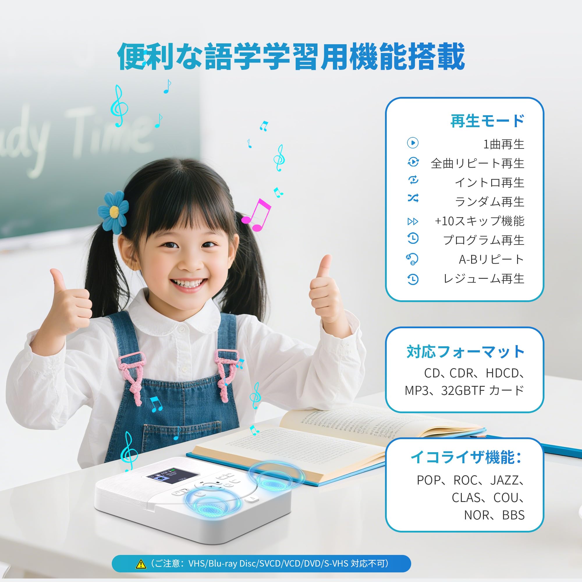 CDプレーヤーBluetooth受信/送信 スピーカー内蔵ポータブルCDプレーヤー壁掛け&卓上置き式 多機能 FMラジオ/AUX/USB再生対応 A-Bリピート再生・ +10スキップ機能 ・ 5EQエフェクト 音楽鑑賞/語学学習/胎児教育 日本語説明書付き