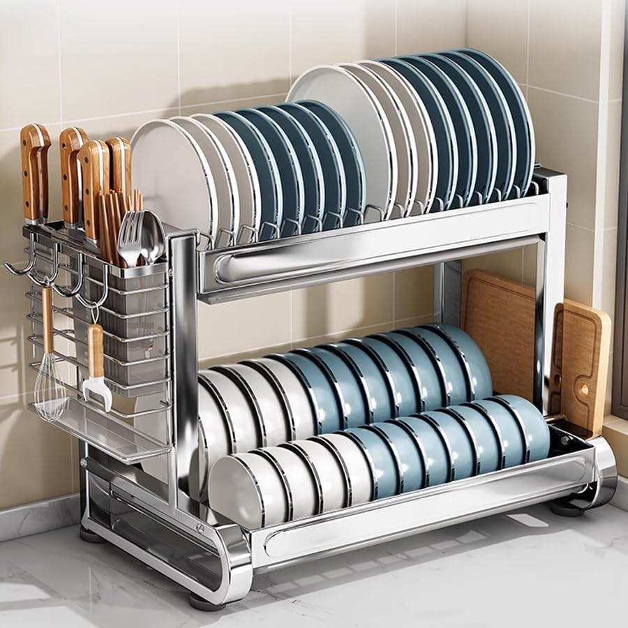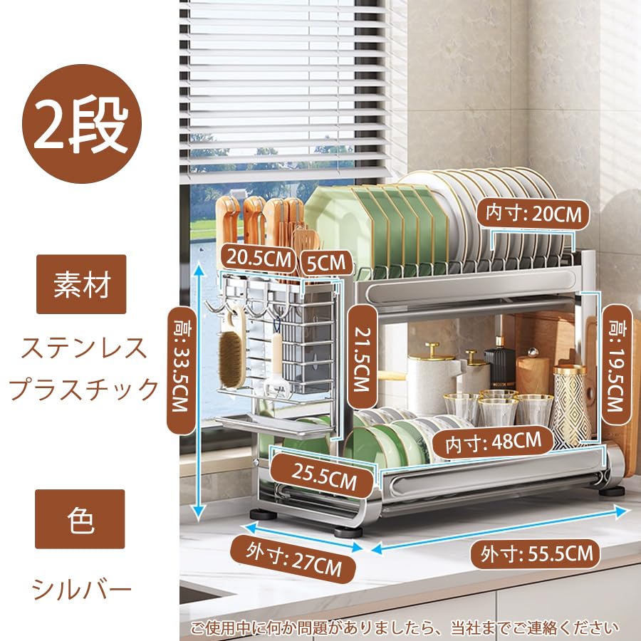 Zilnox 水切りラック ステンレス 食器 水切り かご 大容量 キッチン ラック 多機能収納 省スペース 組立簡単 シルバー 2段 幅55.5*奥行27x高33.5CM