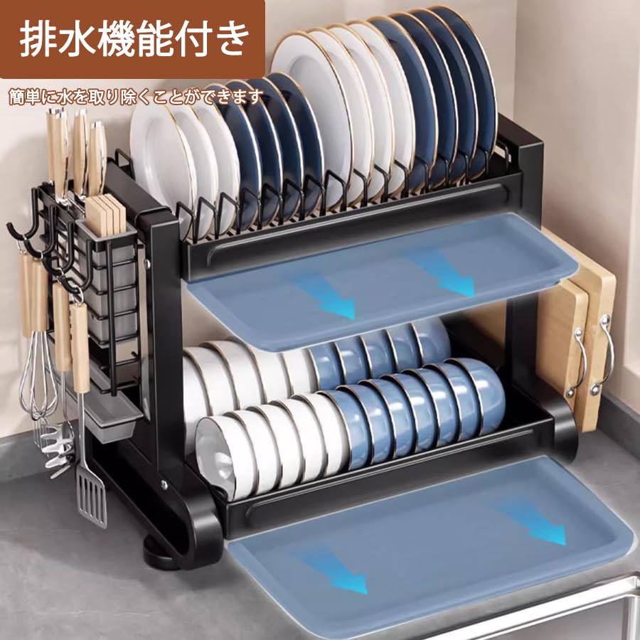 SIUSA 水切りラック 水切りカゴ 2段式 乾燥ラック 自動排水 横置き 錆びない 大容量 キッチン収納 水が流れる 台所 ディッシュラック 皿立て 収納 スタンド 立て 多機能 簡単組立 ブラック