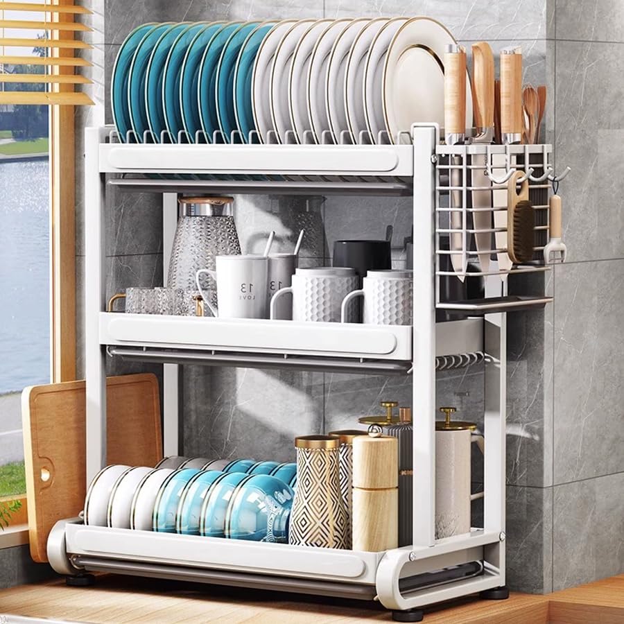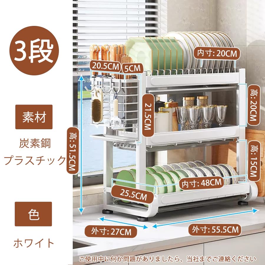 Zilnox 水切りラック 食器 水切り かご 大容量 キッチン ラック 多機能収納 省スペース 組立簡単 ホワイト 3段幅55.5*奥行27x高51.5CM