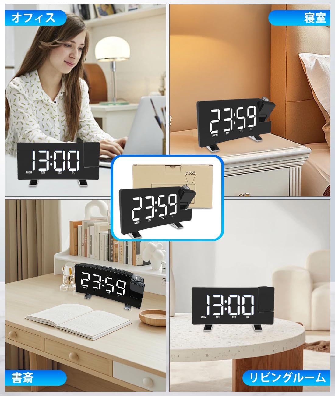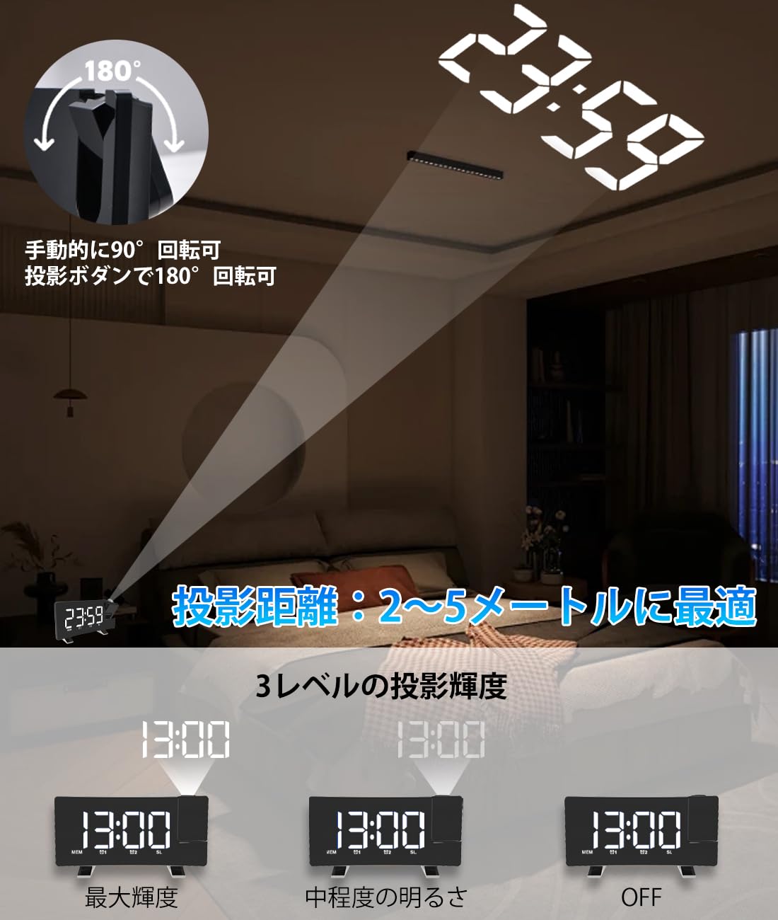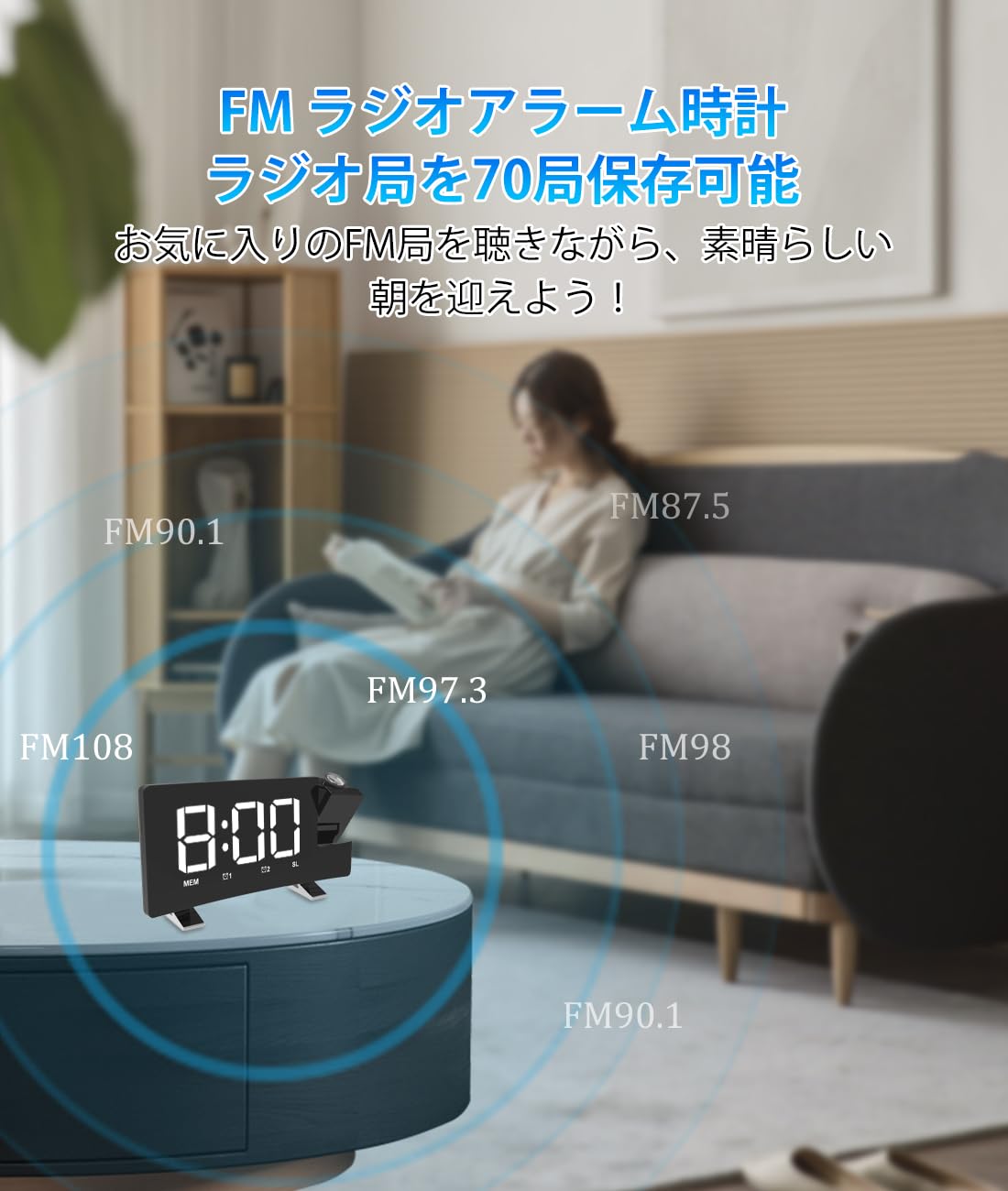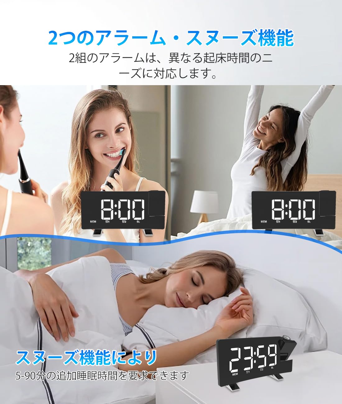 GHDVOP 目覚まし時計 LEDデジタル投影時計 置き時計 7インチ大画面 見やすい 天井投影 時計 180°回転投影 オシャレ 自動調光 4段階明るさ調整 FMラジオ 12H/24H時間表示 アラーム/スヌーズ機能 夜間ライト付 携帯充電可 記憶機能 USB給電 簡単設置 ホーム オフィス インテリア ギフト 日本語説明書付き(ホワイト)