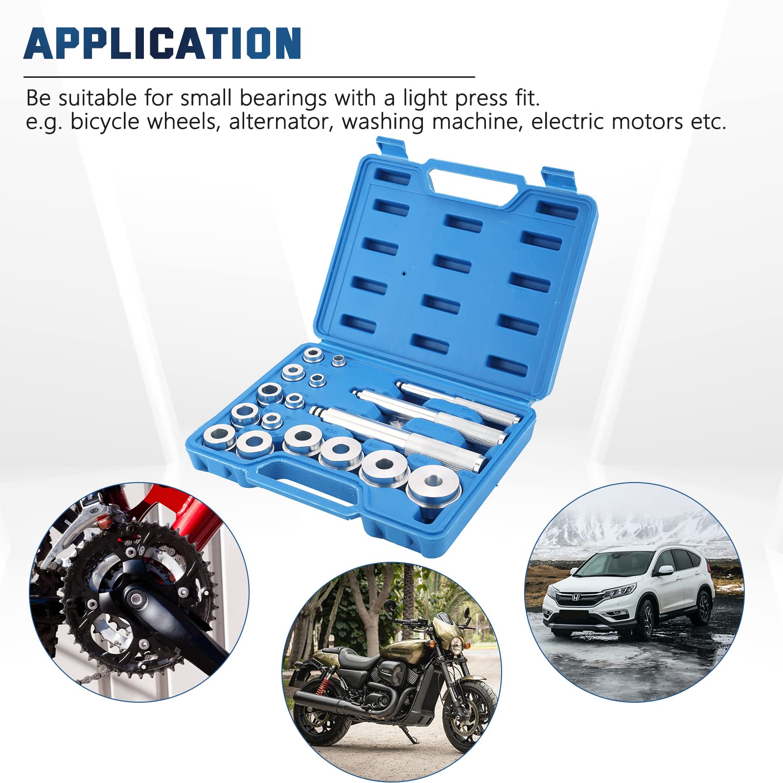 製品詳細 軽い圧入を用いる小さい軸受けのための 1.Designed 具体的に。 自転車の車輪、交流発電機、洗濯機、電動機および多くのような適用の使用のための 2.Ideal。 3.This 用具は取付ける人、ない抽出器として役立ちます。 4.ベアリングの取り外しには別途工具が必要です。 5.このセットは、レースやアクスルハウジングに損傷を与えることなく、ホイールベアリングレースの簡単な挿入とシーリングを可能にします。 6.ほとんどの標準的なブッシュおよびホイールベアリングと互換性があります。 7.Includes 容易な構成のための便利な収納ケース。 使用方法 ベアリングサイズに合ったアタッチメントを選び、ハンドルを取り付ける。ハンドルの後部をハンマーで軽く叩き、均等な取り付けを確実にする。