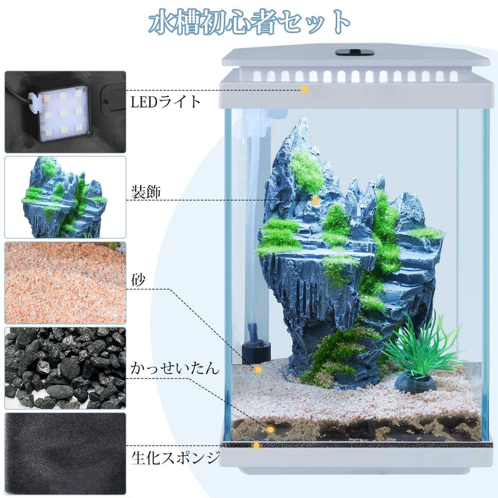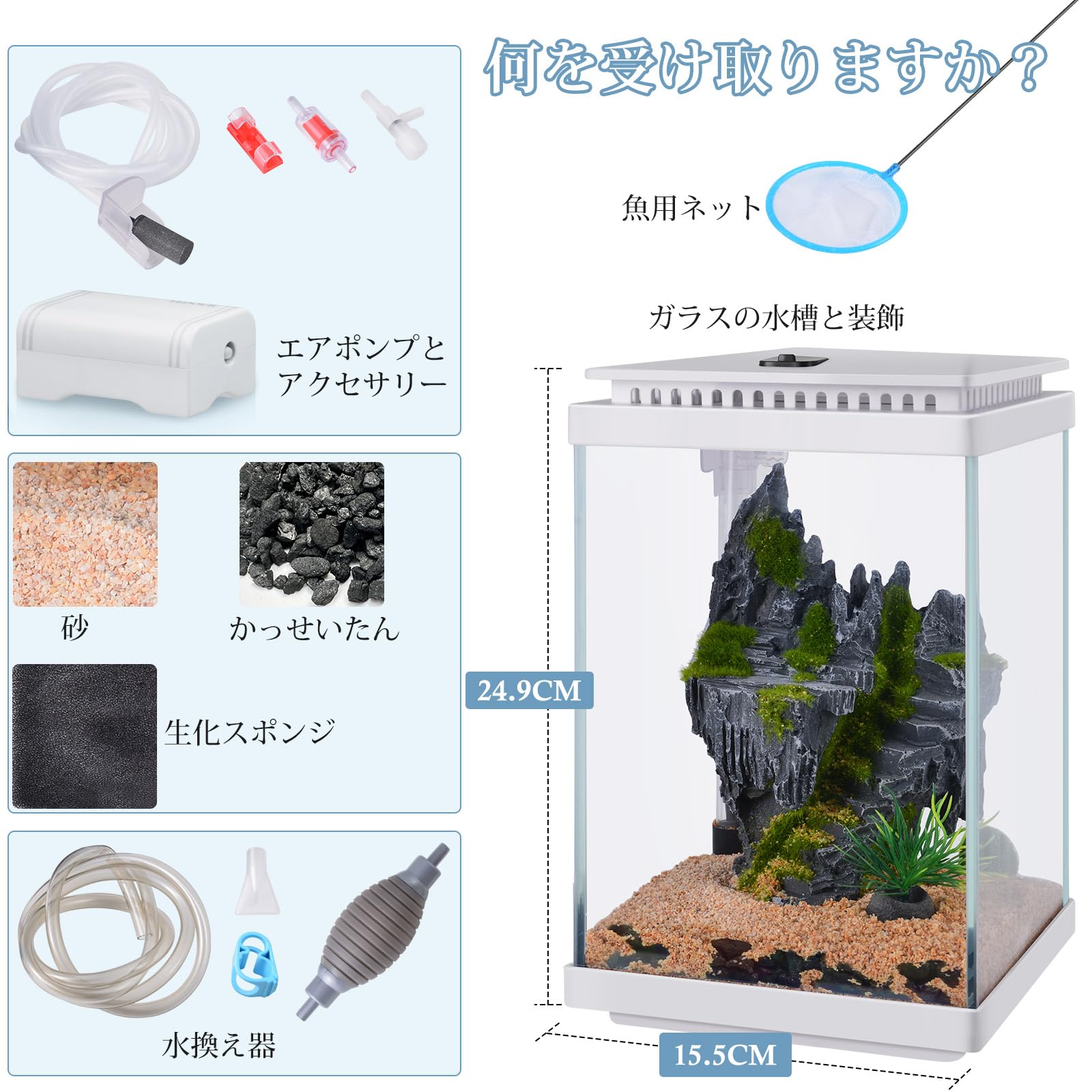 メダカ飼育水槽フルセット(卓上用):水換え簡単、コンパクト、初心者にやさしい,対応ベタ/金魚/熱帯魚,サイズ W10cm×D10cm×H15cm(約 1.7L),同梱水槽+酸素ポンプ+ライト,プレゼント夜光石・小型魚すくい