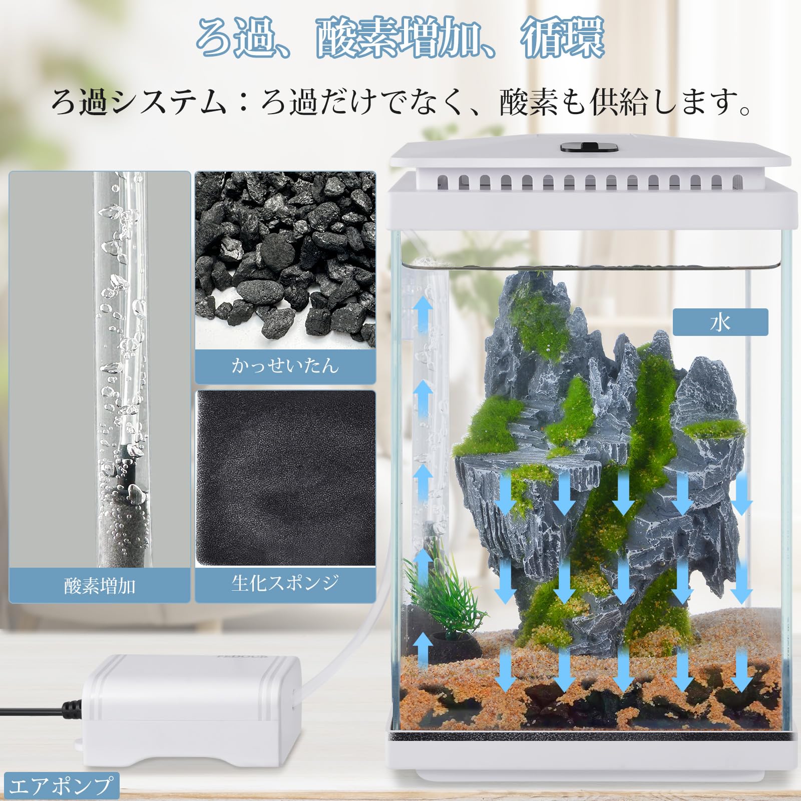Yjhyuxi 水槽 セット 小型 アクアリウム【インボイス制度登録店】メダカ飼育水槽 フルセット 静音 USB式で省エネ LEDライト付 底部濾過システム搭載 フィルター付 初心者にやさしい ベタ/金魚/熱帯魚 卓上用 取扱説明書付(ホワイト,M)