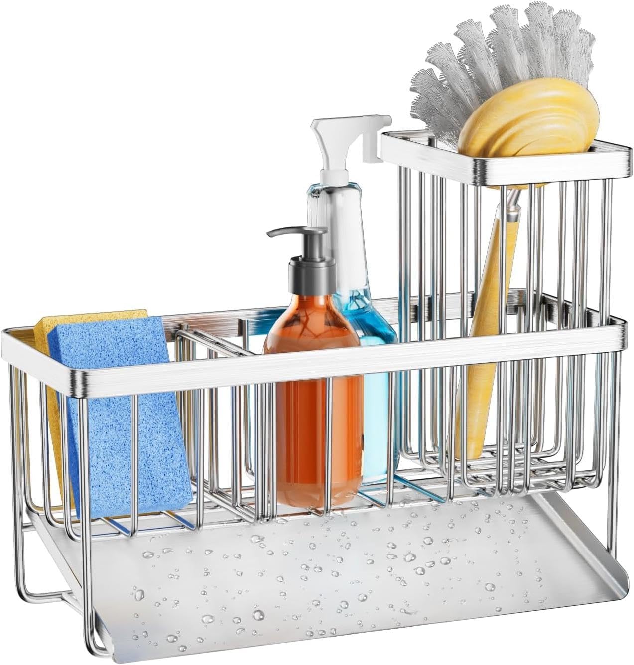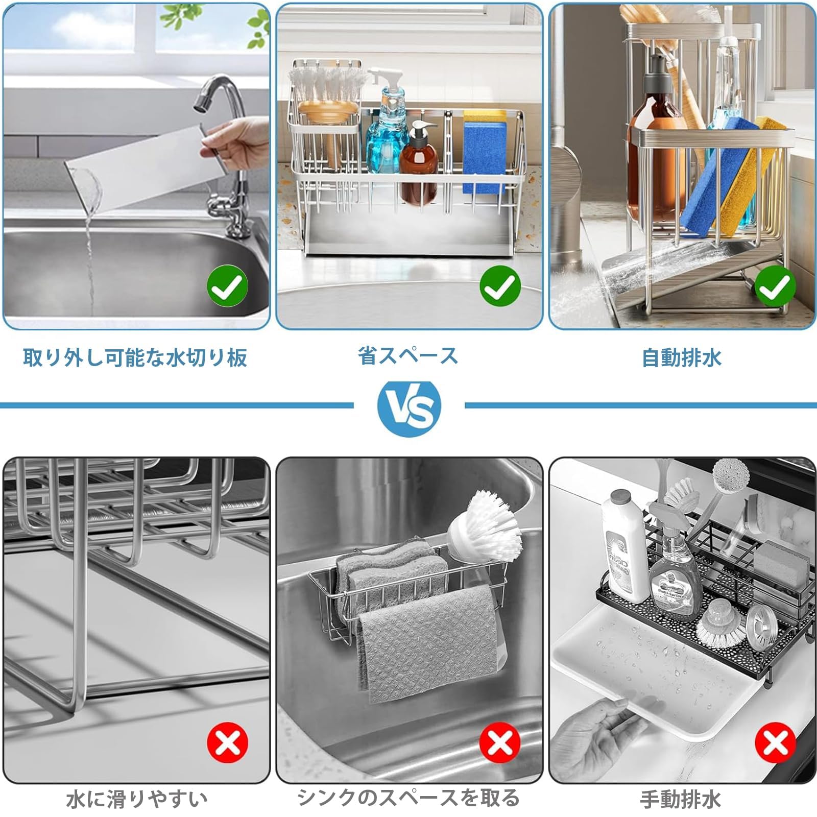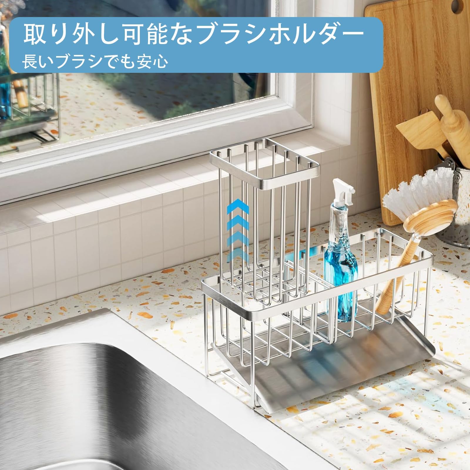 TATIU スポンジホルダー キッチン スポンジ置き 水が流れる 防錆 ステンレス製 キッチン 洗面台 収納 洗剤置き 可動式仕切り 洗面台 収納 ブラシホルダー付き(シルバー)