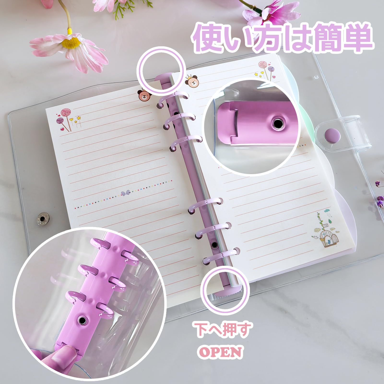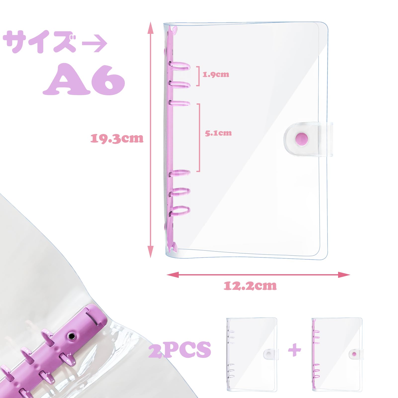 DY.2ten システム手帳 a6 バインダー 6穴 クリア ボタン付き 透明バインダー 詰め替え可能 ノートカバー PVC 日記帳 6リングバインダー (2パック:パープル+ホワイト)