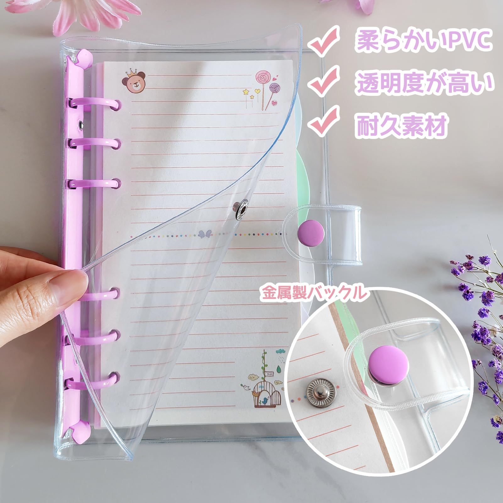 DY.2ten システム手帳 a5 バインダー 6穴 クリア ボタン付き 透明バインダー 詰め替え可能 ノートカバー PVC 日記帳 6リングバインダー (2パック:パープル+ホワイト)