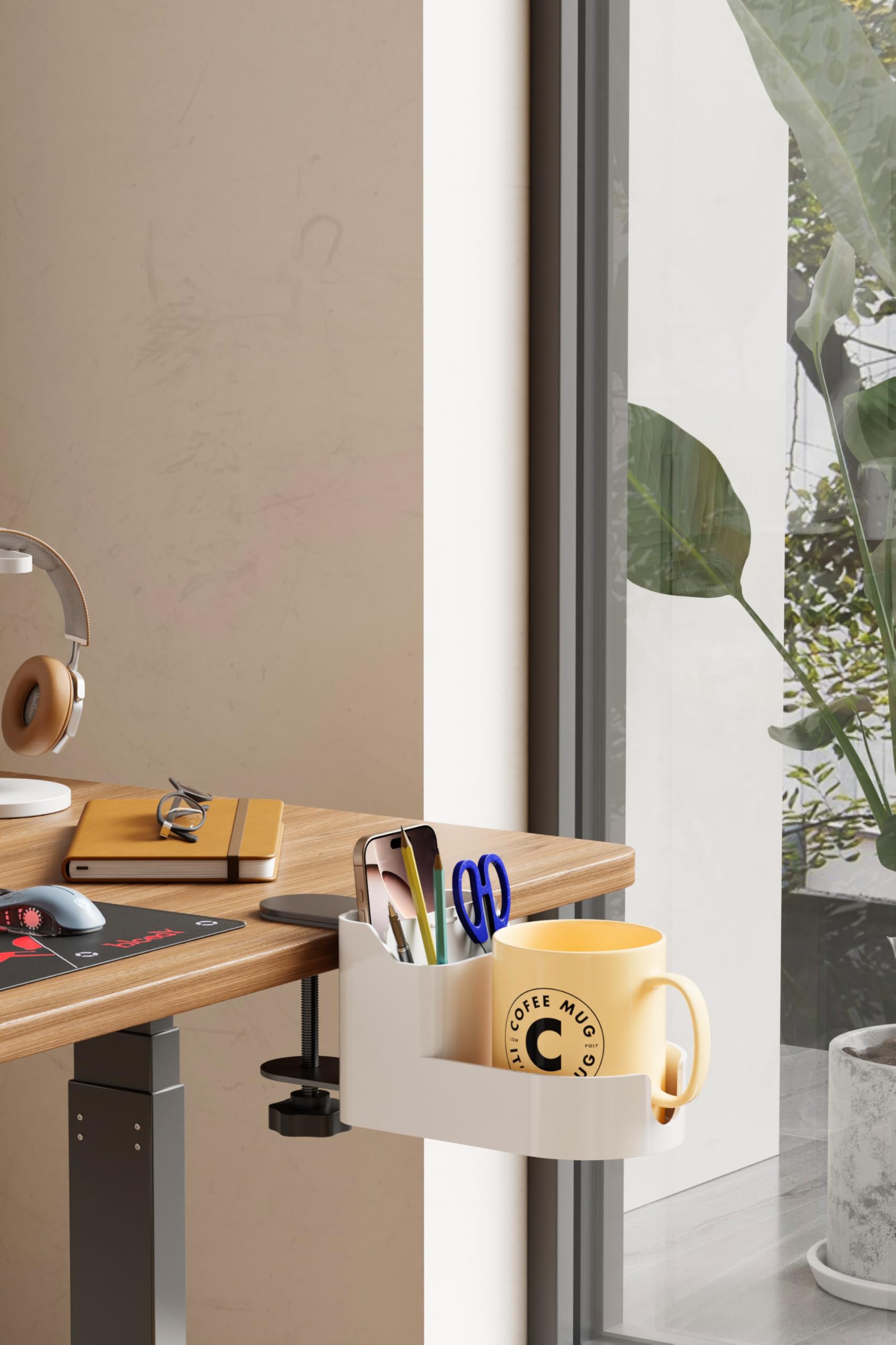 YUYUTORI ドリンクホルダー デスク テーブル横 コップホルダー スマートフォン/リモコン/小物収納 卓上整理 机拡張 デスク 後付け クリップ式 机固定 滑り止め 大容量 スペース節約 簡単設置 ホワイト