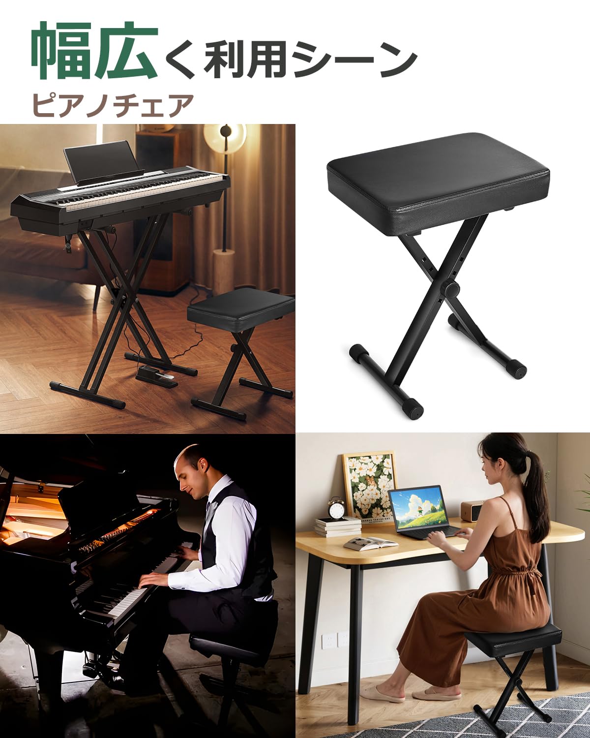 KAKETE ピアノ椅子 キーボード用 ベンチ【4段階高さ調整・極厚6CM座り面】折り畳み収納 X型 キーボード 椅子 電子ピアノチェア高さ42-51.5CM 子供から大人 滑り止めゴム脚 折りたたみイス 軽量 Keyboard Bench 防水防汚 ピアノ/バイオリン/ギター/鉄琴/キーボード演奏に対応